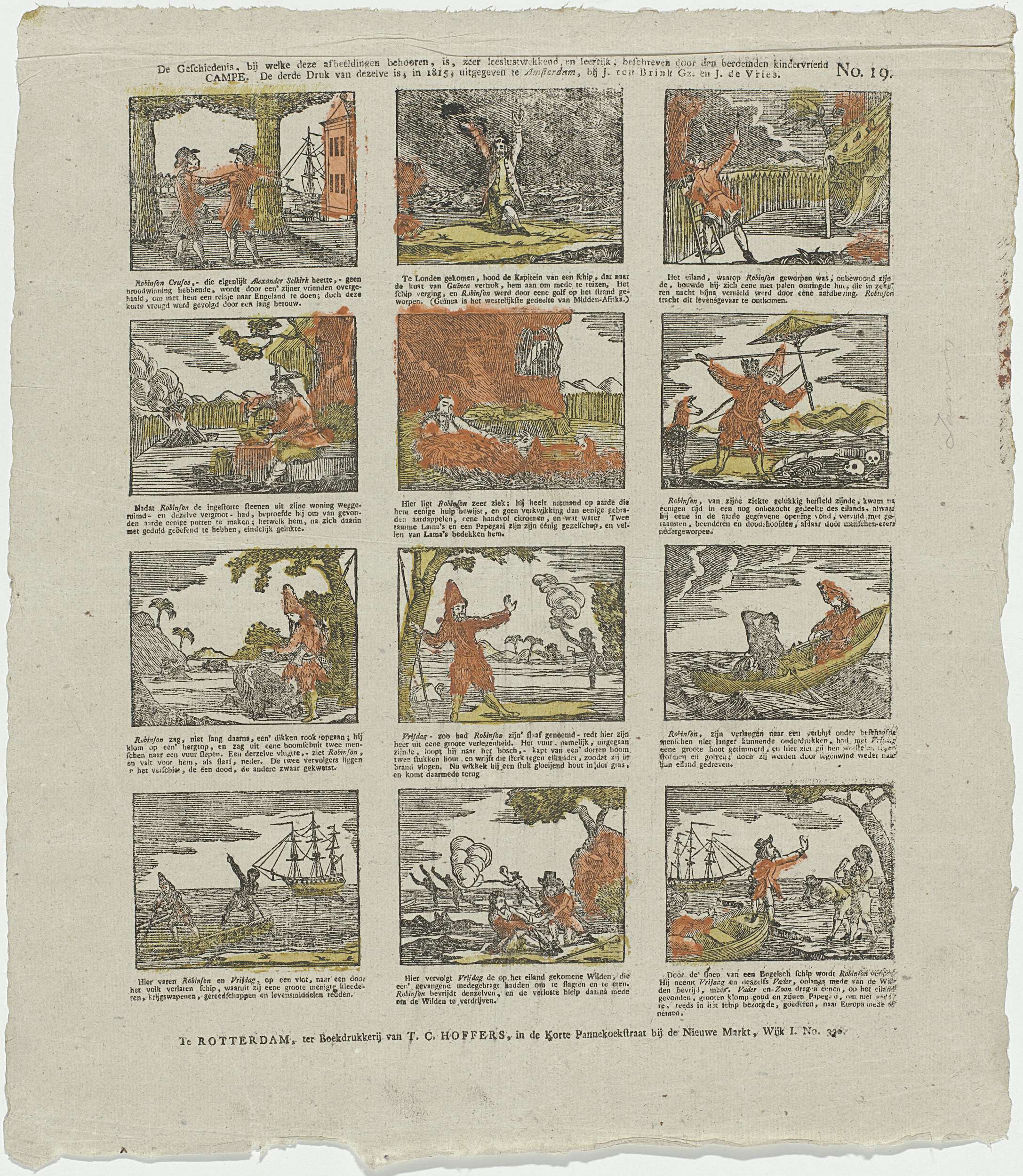 Blad met 12 voorstellingen uit het verhaal van Robinson Crusoe die strandt op een eiland. Onder elke afbeelding een onderschrift. Genummerd rechtsboven: No. 19.