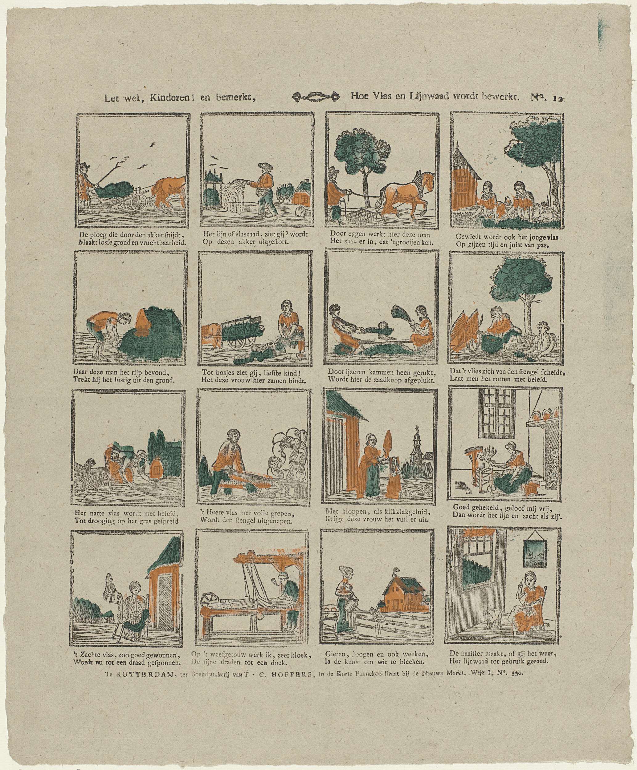 Blad met 16 voorstellingen het oogsten, winnen en bewerken van vlas en lijnzaad. Onder elke afbeelding een tweeregelig vers. Genummerd rechtsboven: No. 12.