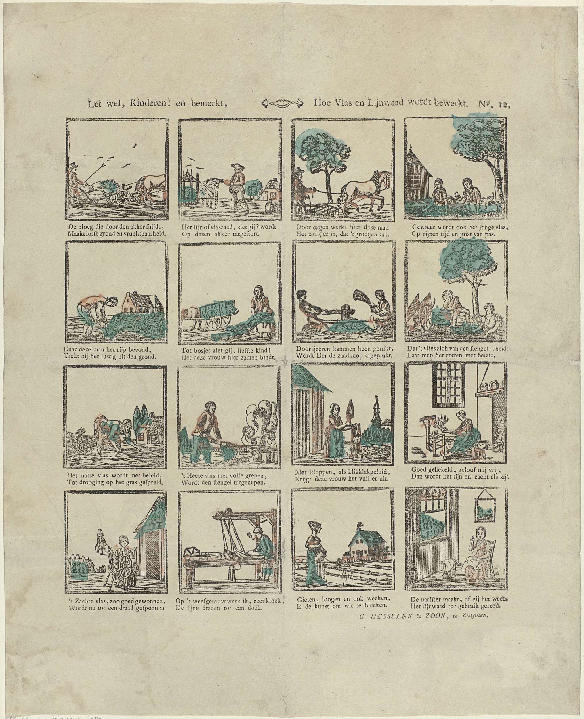 Blad met 16 voorstellingen het oogsten, winnen en bewerken van vlas en lijnzaad. Onder elke afbeelding een tweeregelig vers. Genummerd rechtsboven: No. 12.
