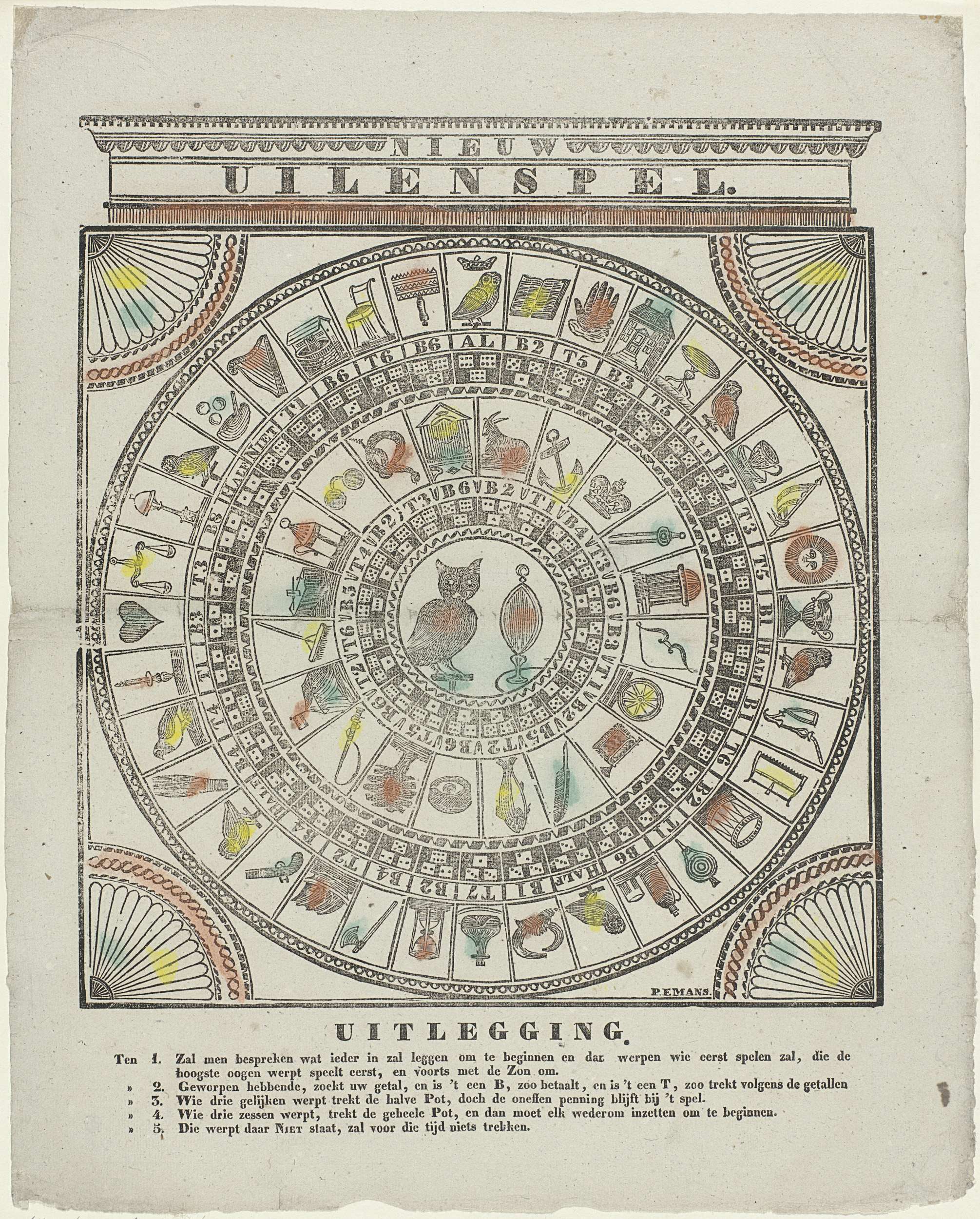 Het Uilenspel. Een cirkelvormig bordspel met vakjes met daarin voorwerpen, dieren en dobbelstenen. In het midden een uil met een spiegel. Onder de voorstelling de spelregels