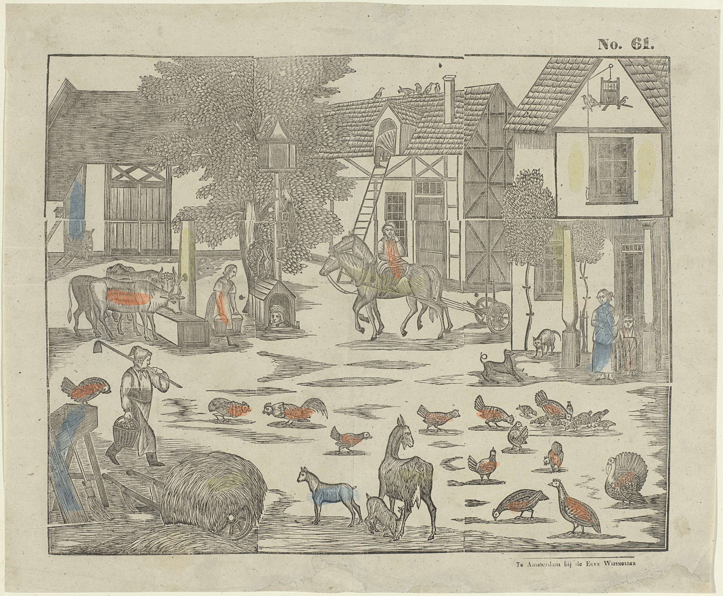 Een boerderij met boeren, boerinnen en dieren, waaronder koeien, paarden, geiten en kippen. Genummerd rechtsboven: No. 61.