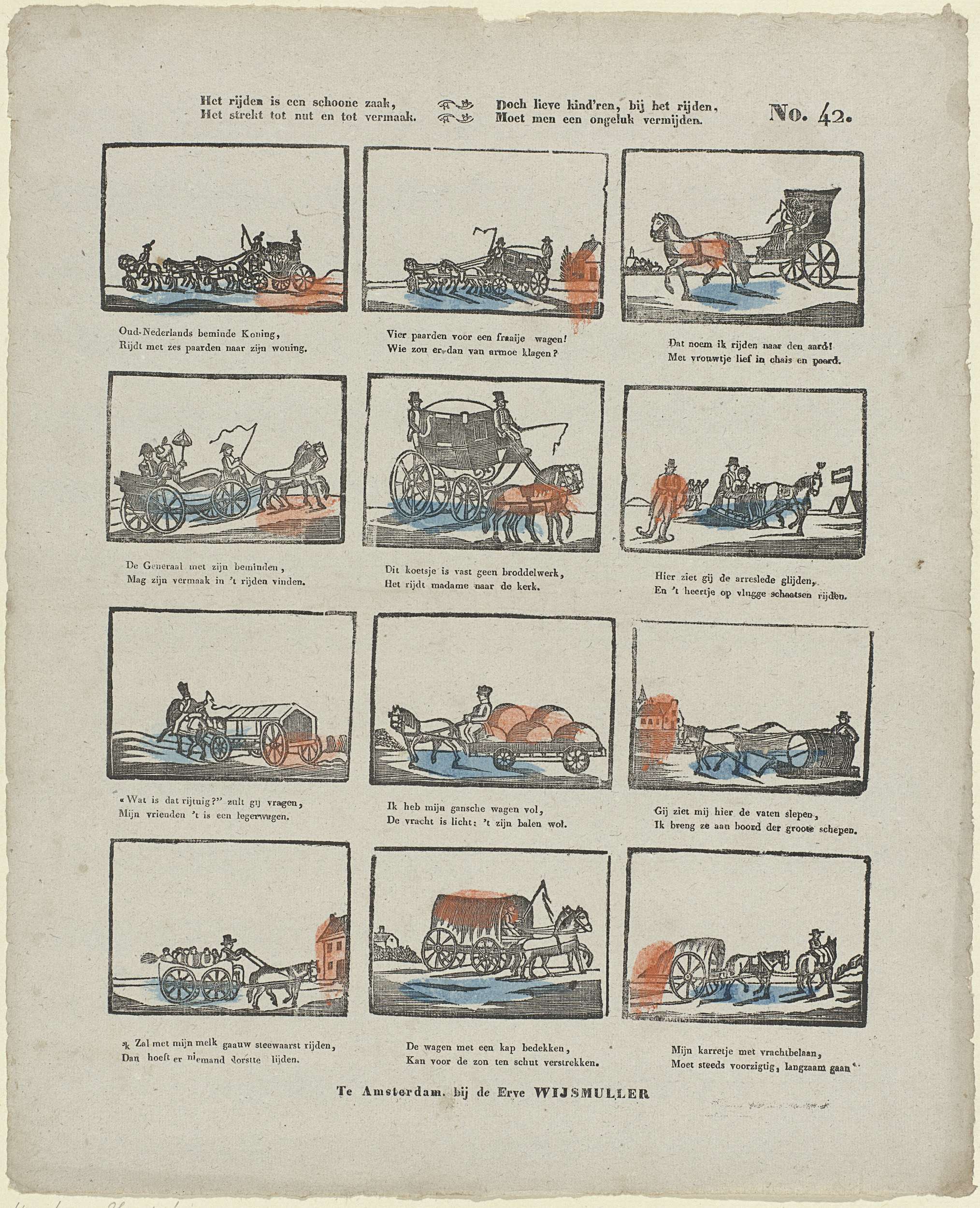 Blad met 12 voorstellingen van koetsen, karren en wagens met personen en vracht, getrokken door paarden. Onder elke afbeelding een tweeregelig vers. Genummerd rechtsboven: No. 42.