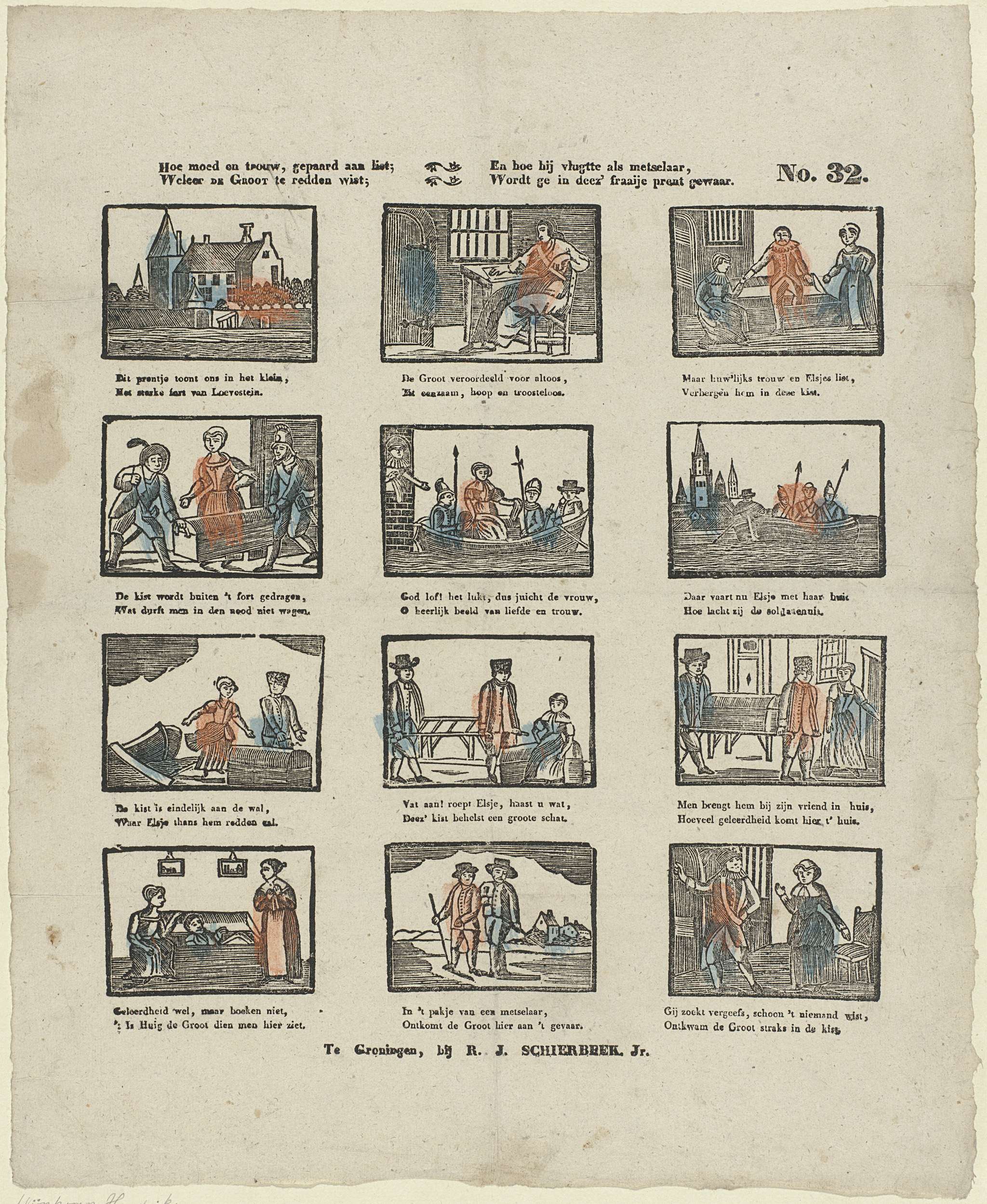 Blad met 12 voorstellingen over de ontsnapping van Hugo de Groot uit Slot Loevestein. Onder elke afbeelding een tweeregelig vers. Genummerd rechtsboven: No. 32.