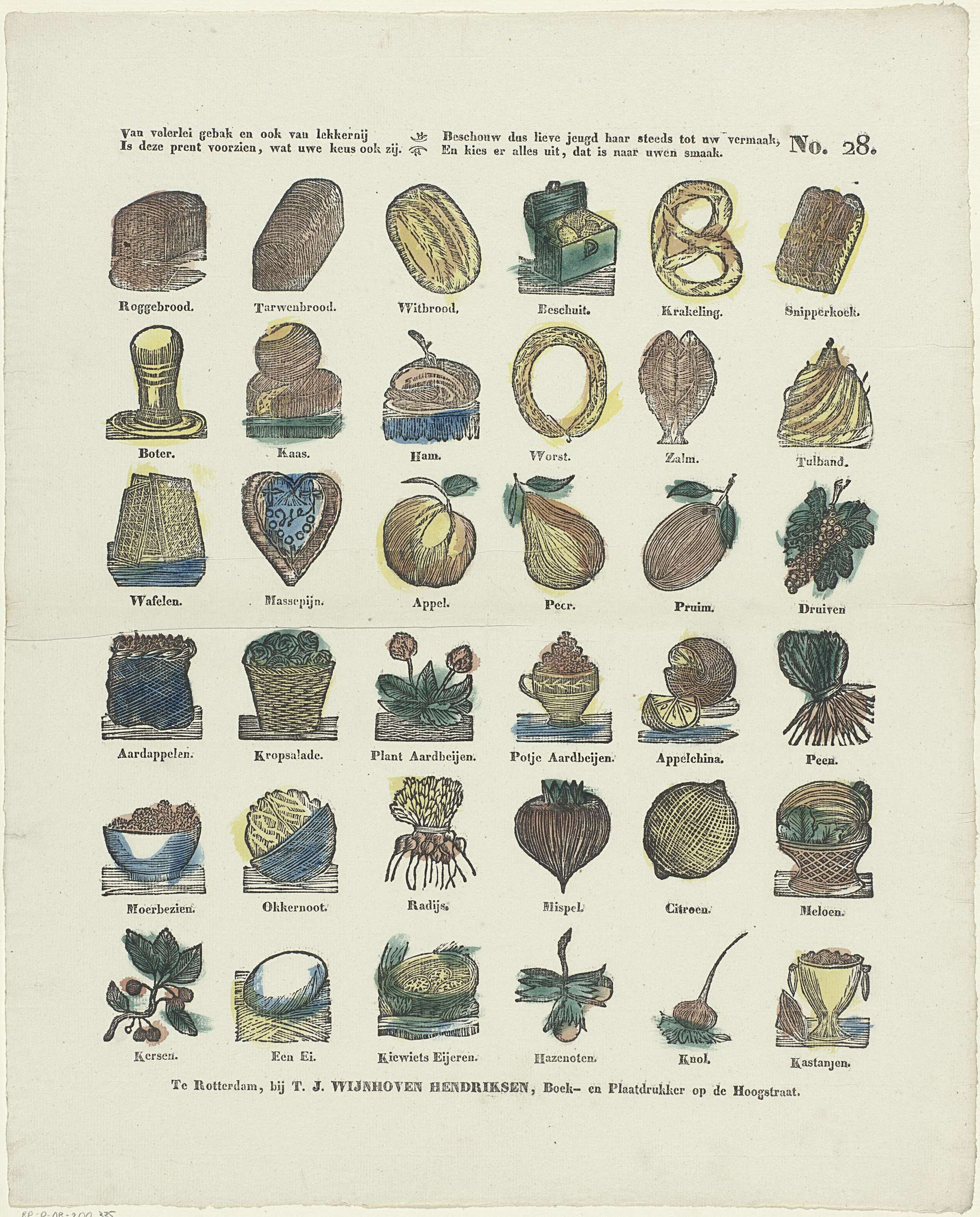Blad met 36 voorstellingen van etenswaren, zoals roggebrood, zalm, peer en knol. Onder elke voorstelling een onderschrift. Genummerd rechtsboven: No. 28.