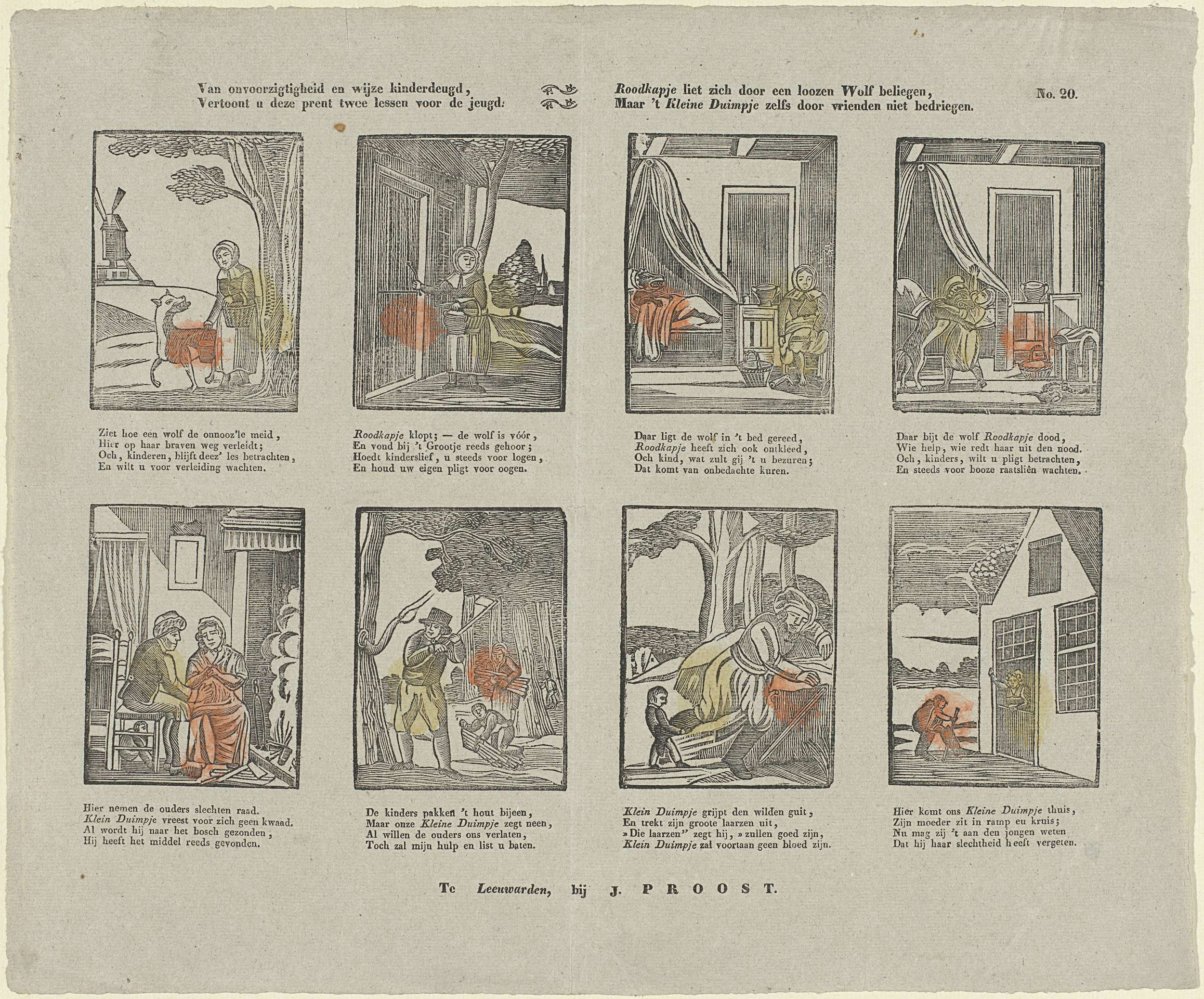 Blad met 8 voorstellingen. De bovenste vier afbeeldingen tonen het verhaal van Roodkapje. De onderste vier voorstellingen tonen het sprookje van Klein Duimpje. Onder elke afbeelding een vierregelig vers. Genummerd rechtsboven: No. 20.