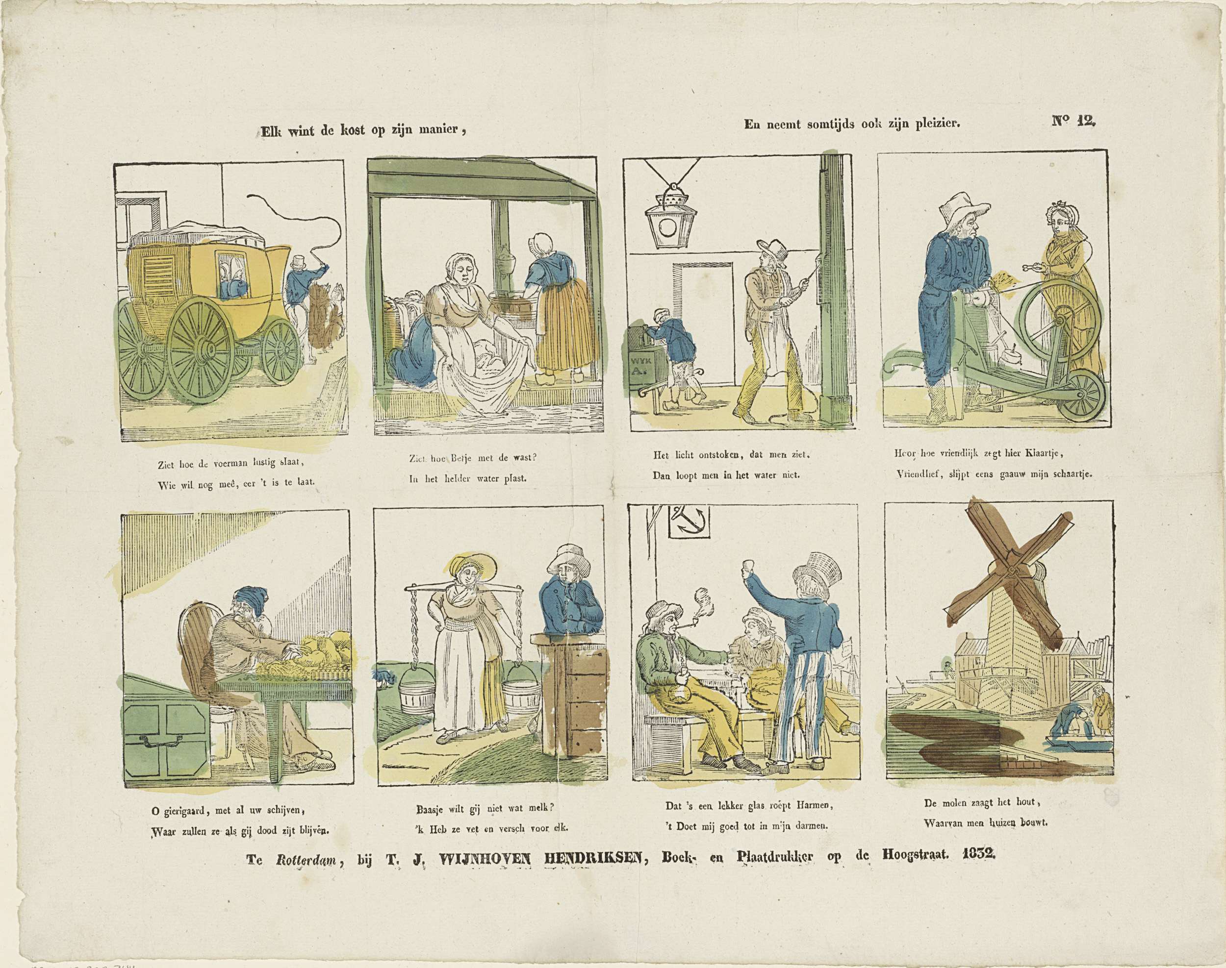 Blad met 8 voorstellingen van ambachtslieden, beroepen en bezigheden, zoals een vrouw die de was doet en een scharenslijper. Onder elke voorstelling een tweeregelig vers. Genummerd rechtsboven: No. 12.