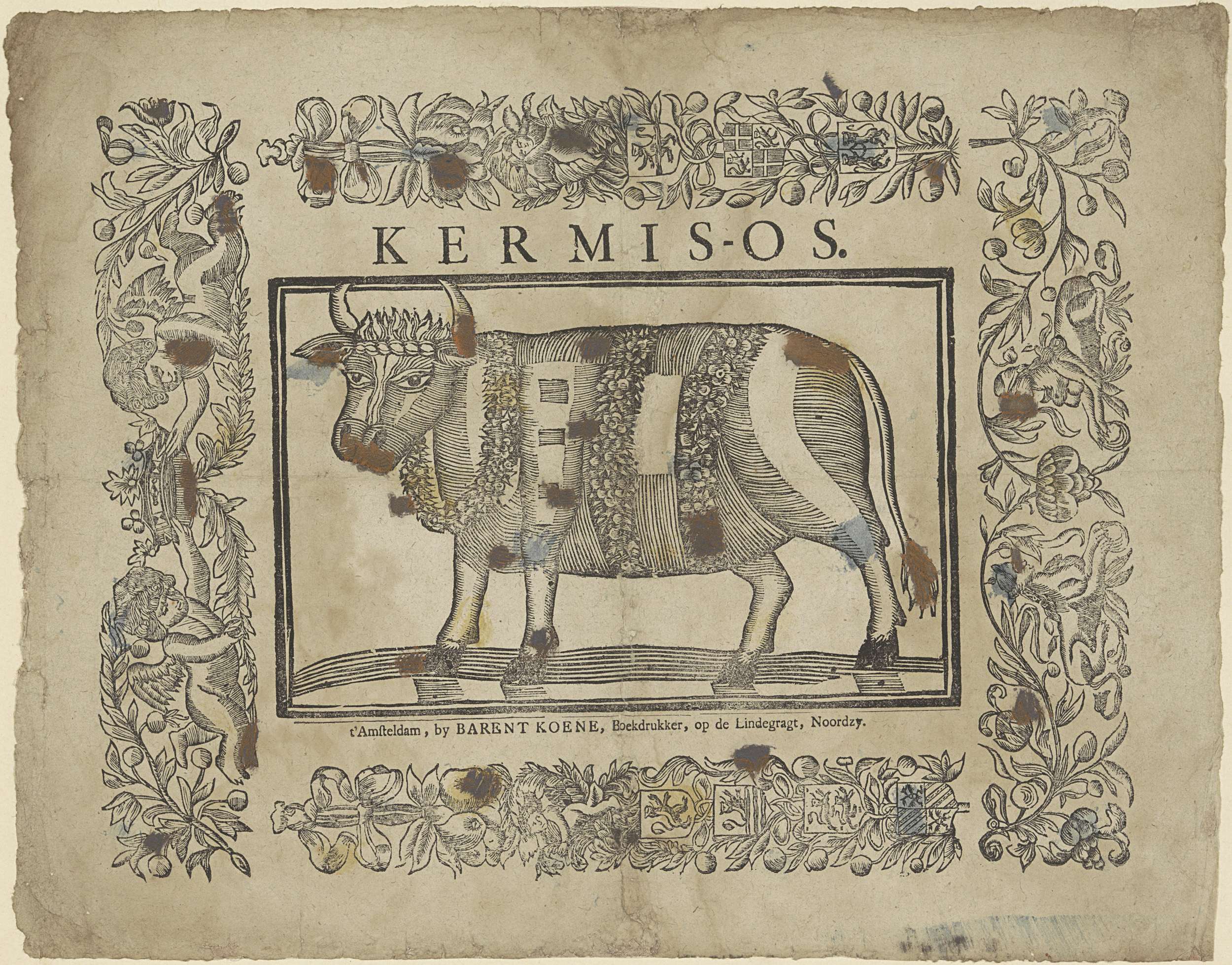 Blad met een grote voorstelling van een gilde-os (ook kermisos of prijsos genoemd), versierd met bloemenkransen. De voorstelling is gevat in een lijst van ranken met bloemen, vruchten, sfinxen en putti.