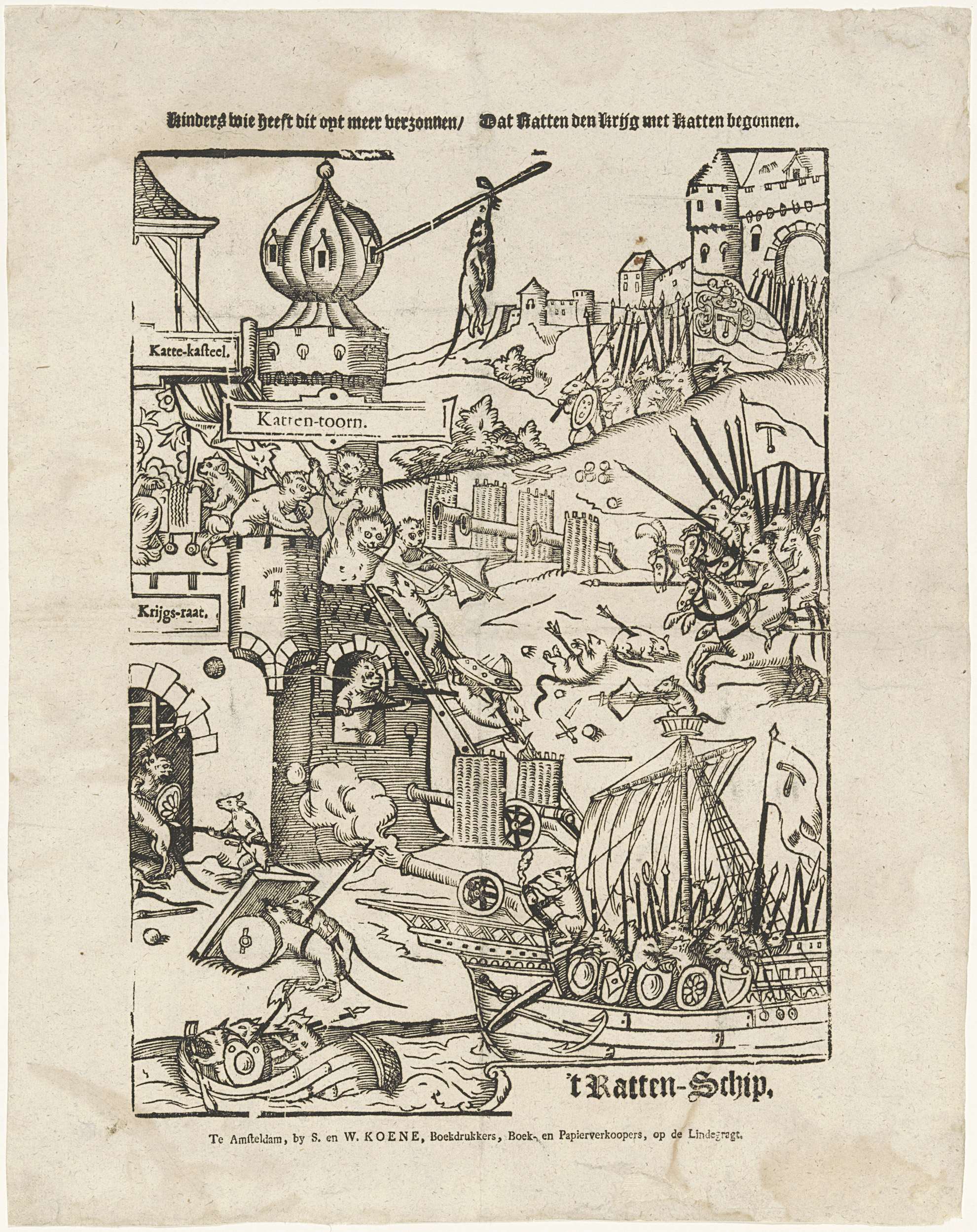 Het Rattenschip. Satirische voorstelling van de oorlog tussen ratten en katten. Een schip vol ratten valt een toren vol katten aan.
