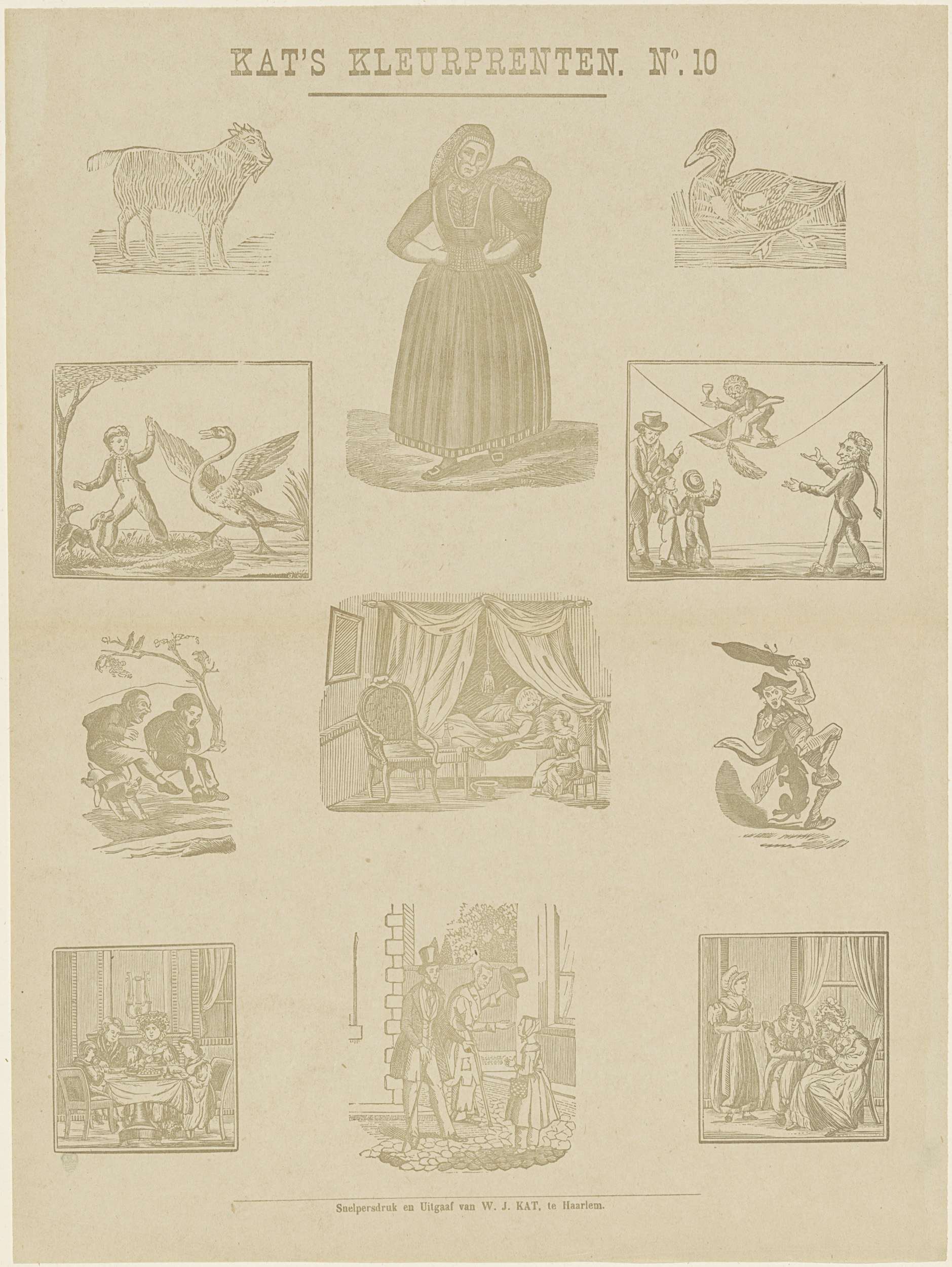 Blad met 11 afbeeldingen van verschillende onderwerpen, bedoeld om uit te knippen en in te kleuren. Weergegeven zijn onder meer een schaap, een verkoopster met rugmand, een eend en een man met paraplu die gebeten wordt door een hond. Genummerd rechtsboven: No. 10.
