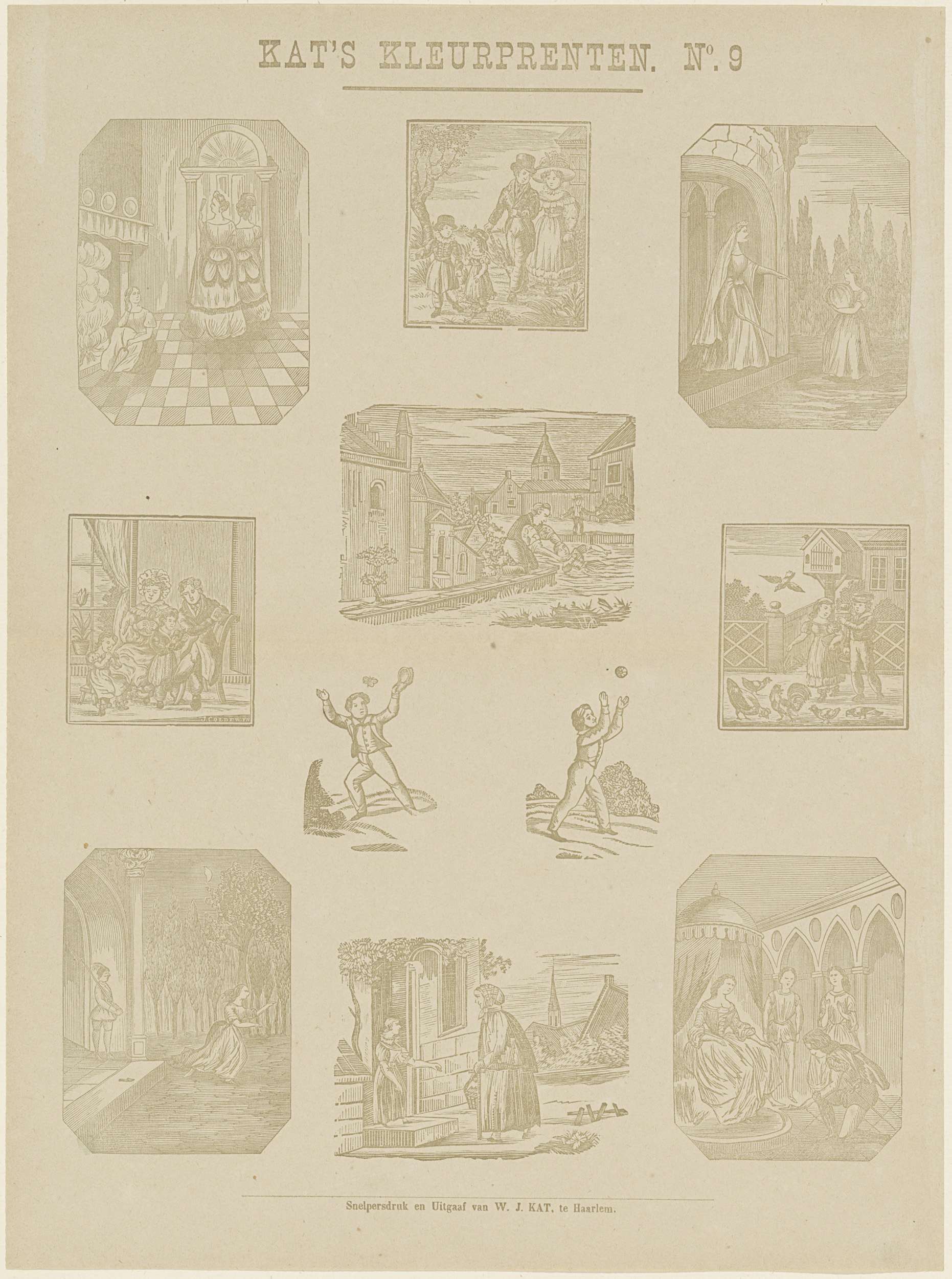 Blad met 11 afbeeldingen van verschillende onderwerpen, bedoeld om uit te knippen en in te kleuren. Weergegeven zijn onder meer Assepoester, een gezin op wandeling en een man die een kind redt uit het water. Genummerd rechtsboven: No. 9.