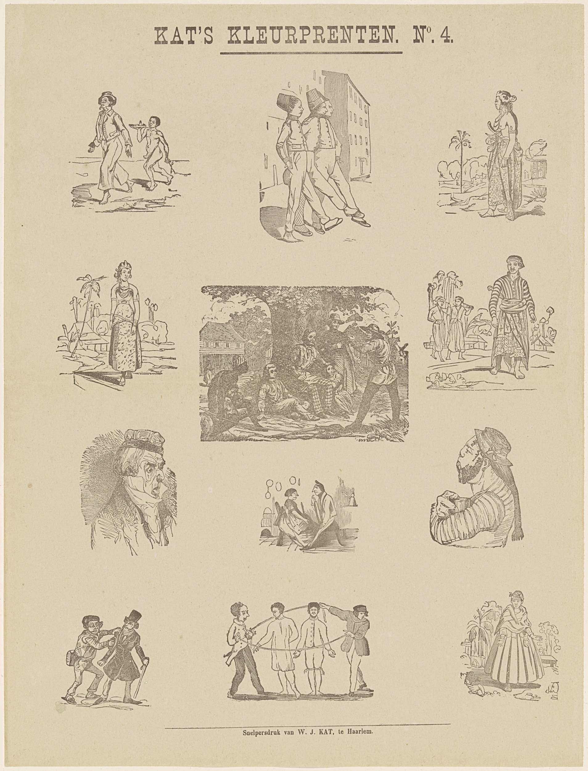 Blad met 12 afbeeldingen van verschillende onderwerpen, bedoeld om uit te knippen en in te kleuren. Weergegeven zijn onder meer karikaturen en mensen uit verschillende culturen. Genummerd rechtsboven: No. 4.