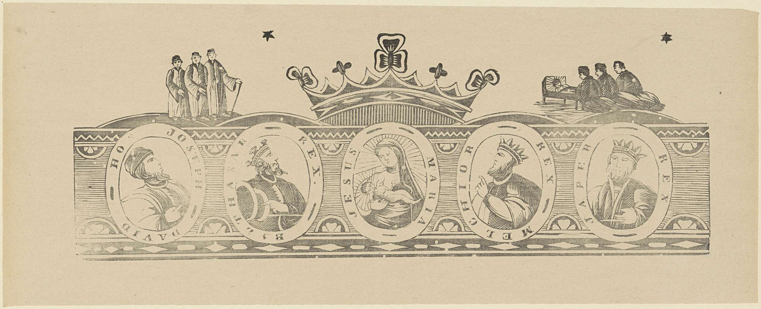 Kroon om uit te knippen. Deze kronen werden tijdens het driekoningenfeest gedragen nadat de briefjes waren getrokken. Op de kroon staan afgebeeld Maria, Jozef en de drie koningen.