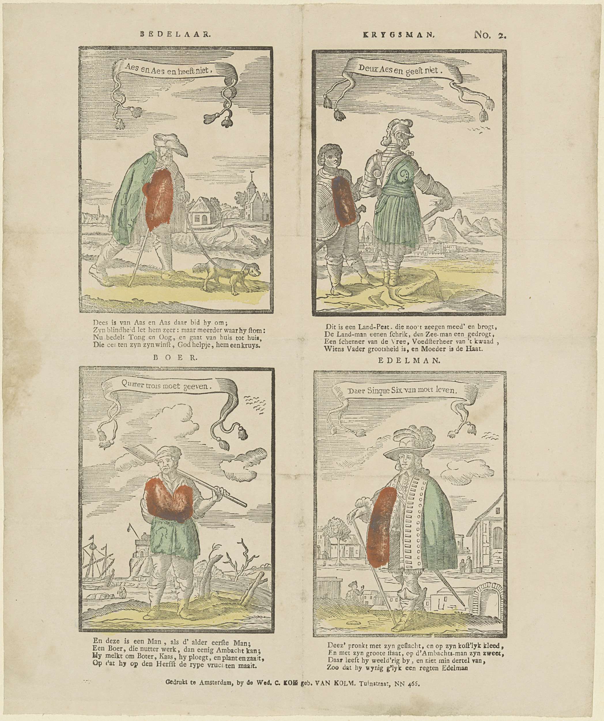 Blad met 4 voorstellingen van een bedelaar, een soldaat, een boer en een edelman (de vier standen). Boven elk figuur een banderol met tekst. Onder elke afbeelding een vierregelig vers. Genummerd rechtsboven: No. 2.