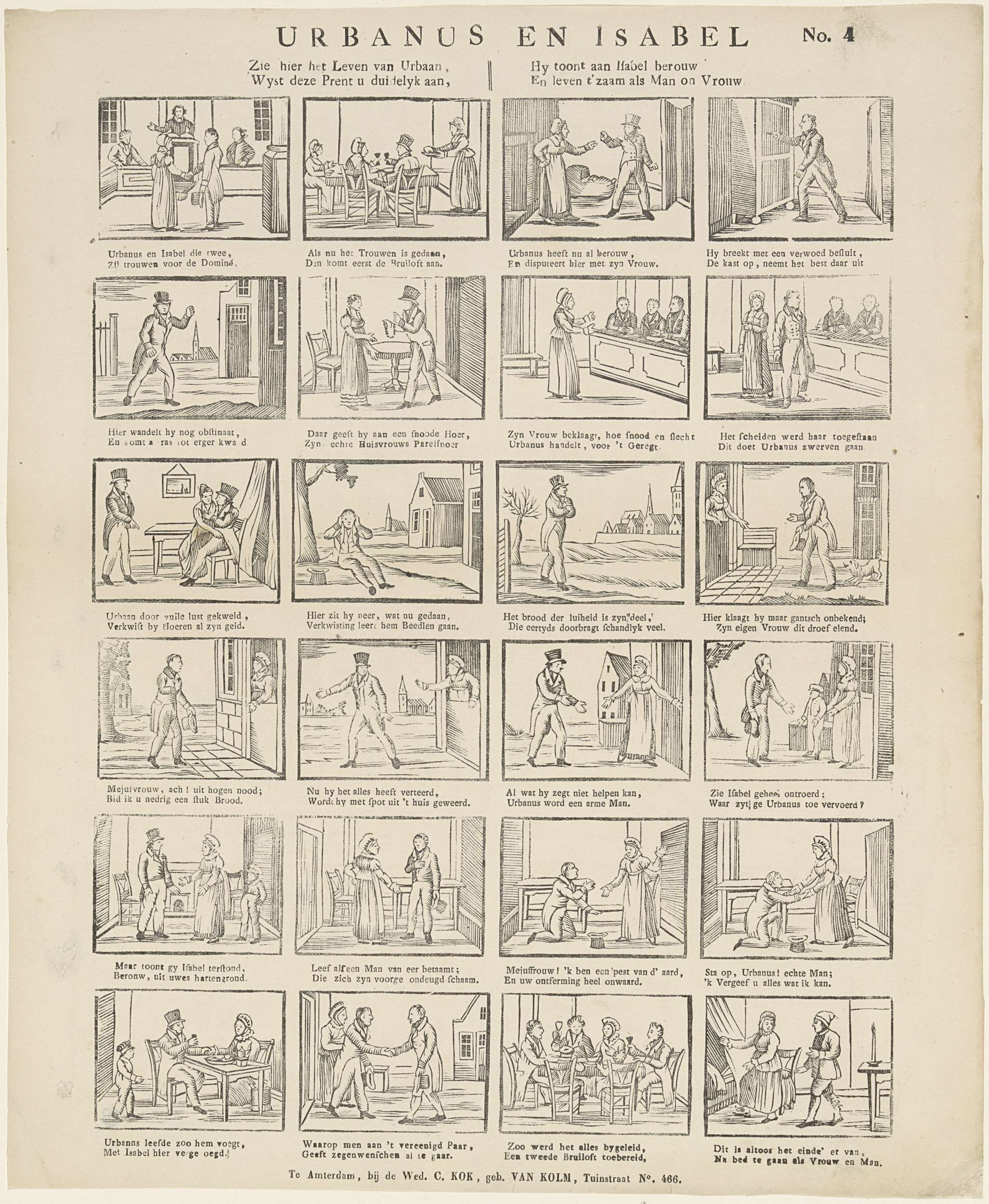 Blad met 24 voorstellingen uit het leven van Urbanus en Isabel. Ze trouwen, maken ruzie, gaan scheiden, en Urbanus wordt een bedelaar. Onder elke afbeelding een tweeregelig vers. Genummerd rechtsboven: No. 4.