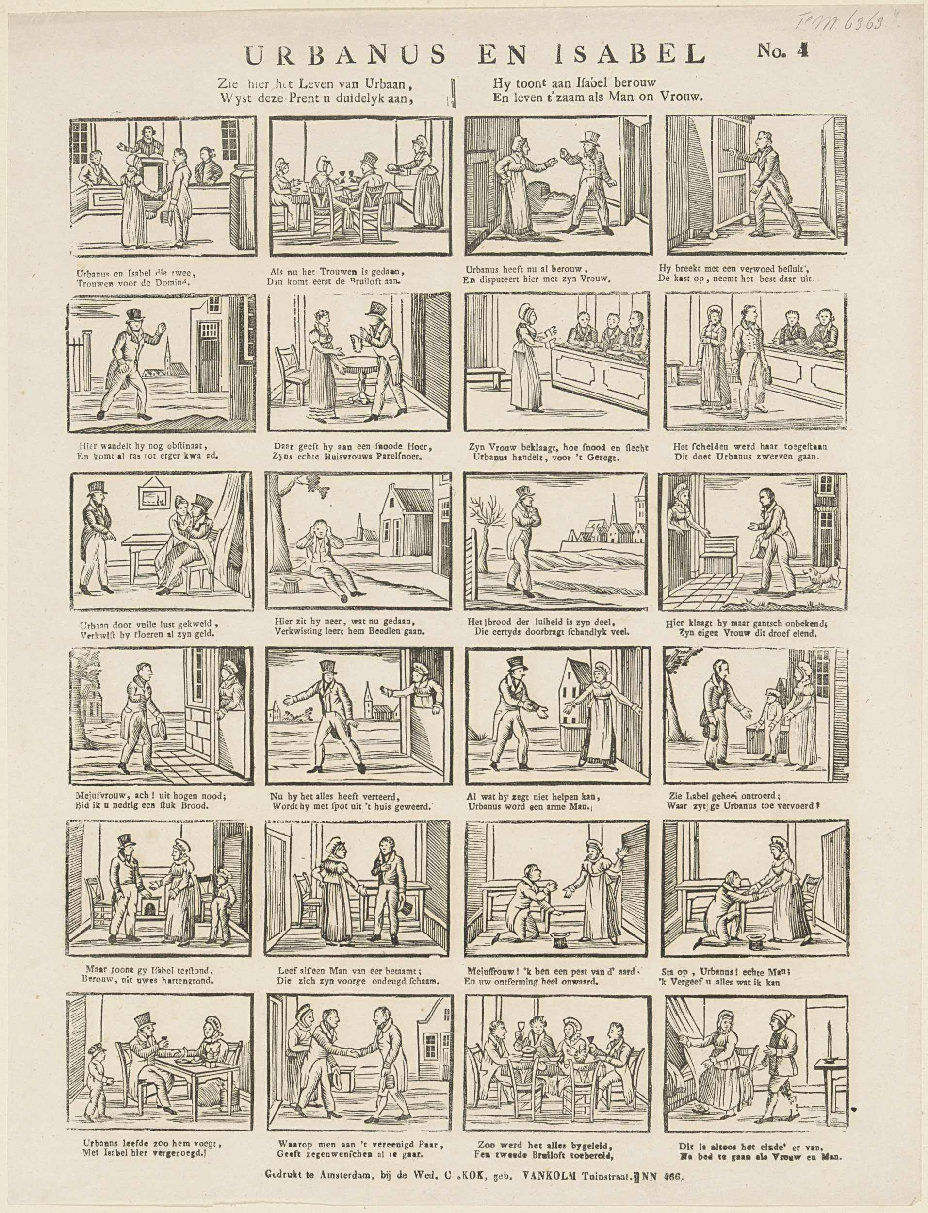 Blad met 24 voorstellingen uit het leven van Urbanus en Isabel. Ze trouwen, maken ruzie, gaan scheiden, en Urbanus wordt een bedelaar. Onder elke afbeelding een tweeregelig vers. Genummerd rechtsboven: No. 4.