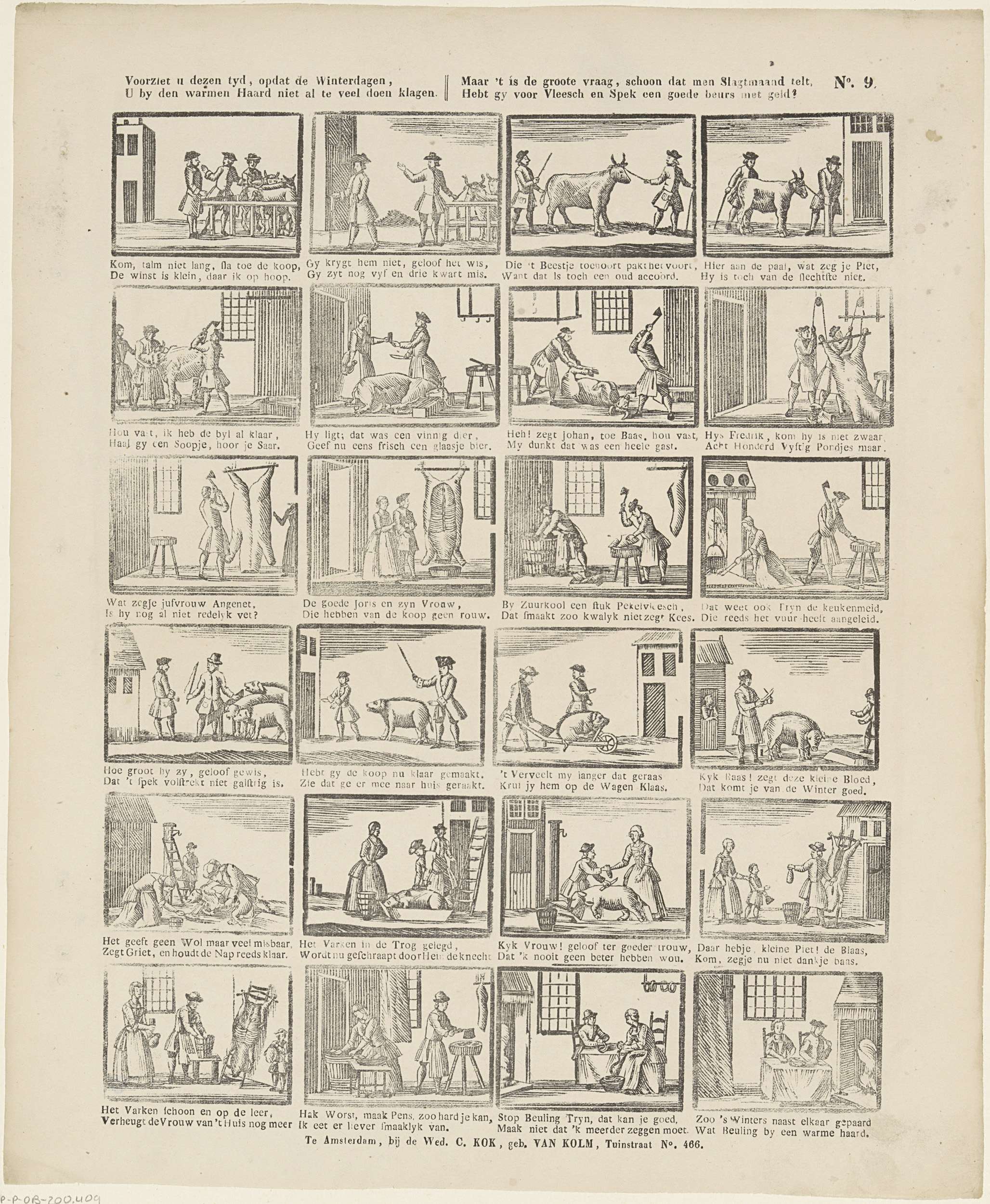 Blad met 24 voorstellingen van het fokken, slachten en bereiden van koeien en varkens (de slachttijd). Onder elke afbeelding een tweeregelig vers. Genummerd rechtsboven: No 9.