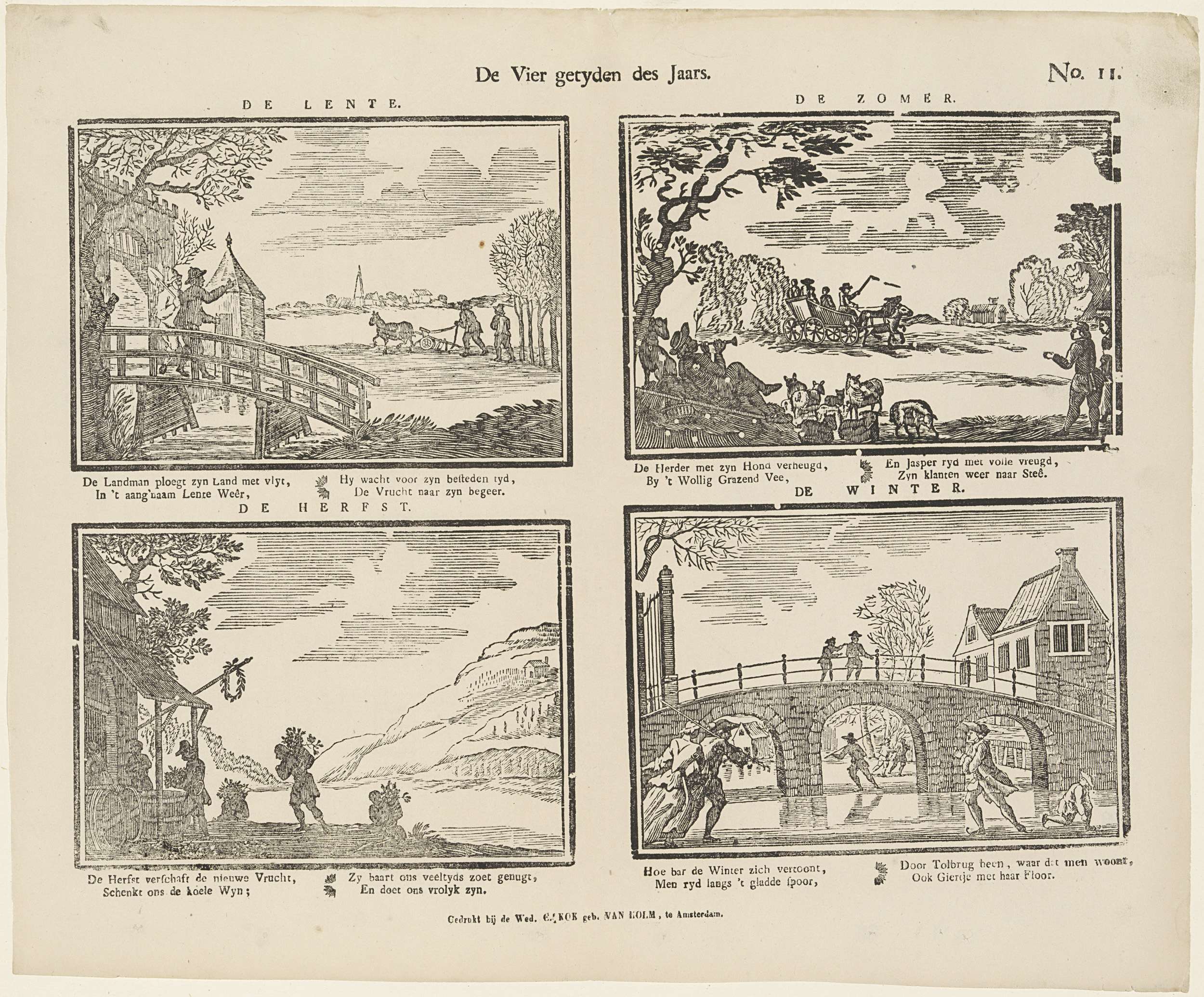 Blad met 4 voorstellingen van de vier jaargetijden uitgebeeld met landschappen. Onder elke afbeelding een vierregelig vers in twee kolommen. Genummerd rechtsboven: No 11.