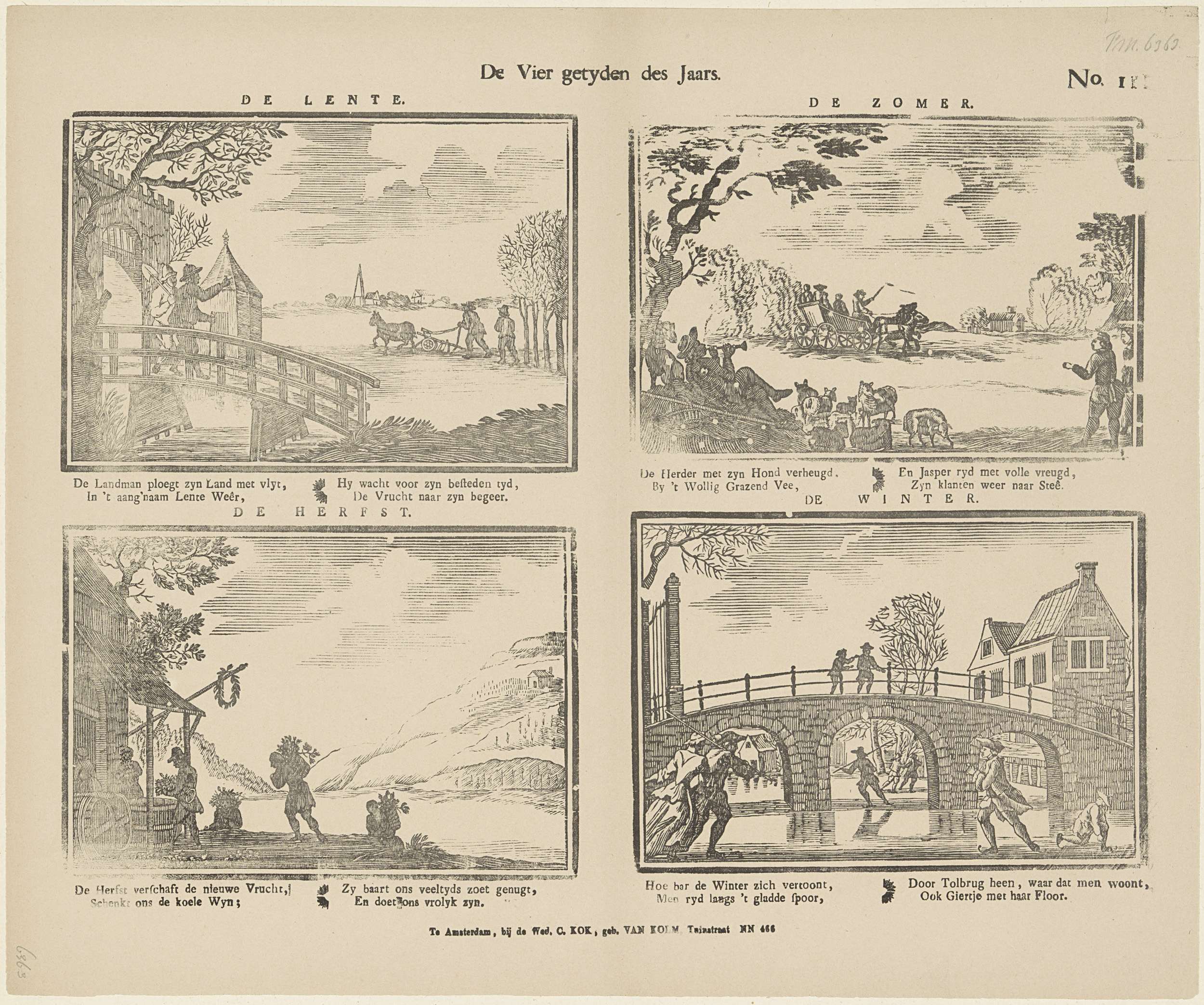 Blad met 4 voorstellingen van de vier jaargetijden uitgebeeld met landschappen. Onder elke afbeelding een vierregelig vers in twee kolommen. Genummerd rechtsboven: No 11.