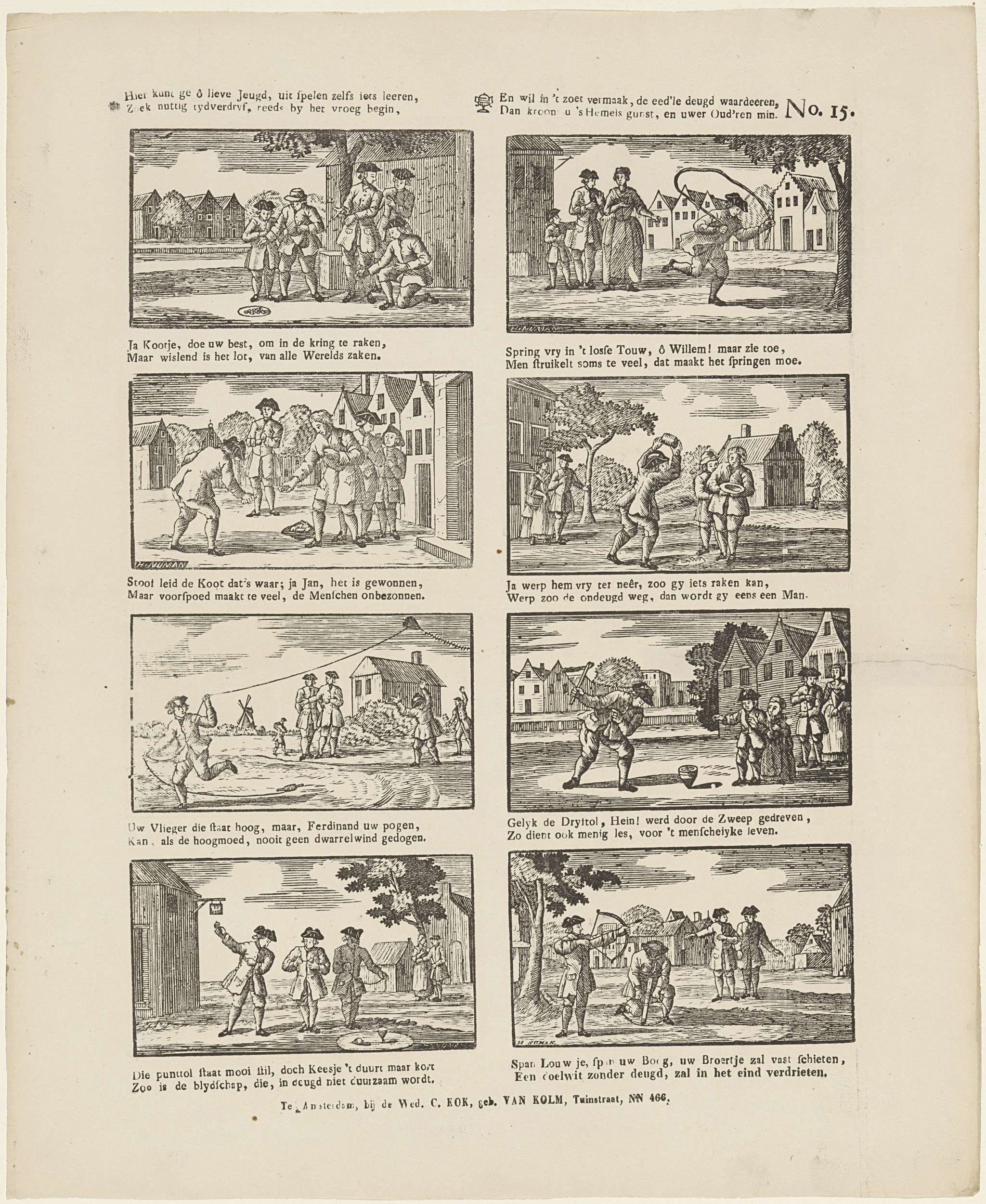 Blad met 8 voorstellingen van kinderspelen, waaronder touwtjespringen, vliegeren en tollen. Onder elke afbeelding een tweeregelig vers. Genummerd rechtsboven: No. 15.