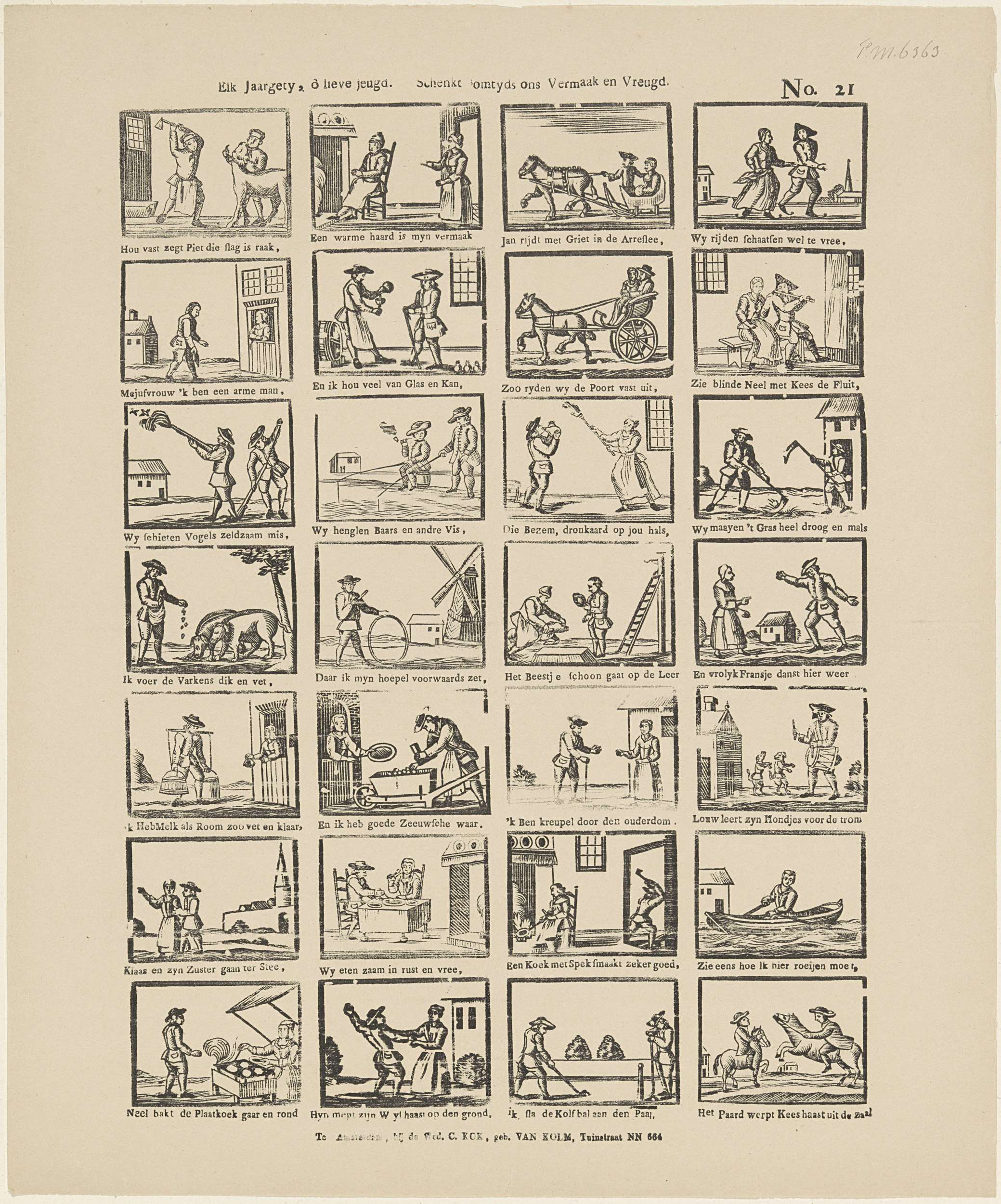 Blad met 28 voorstellingen van landelijke taferelen tijdens de verschillende jaargetijden. Onder elke afbeelding een onderschrift. Genummerd rechtsboven: No. 21.