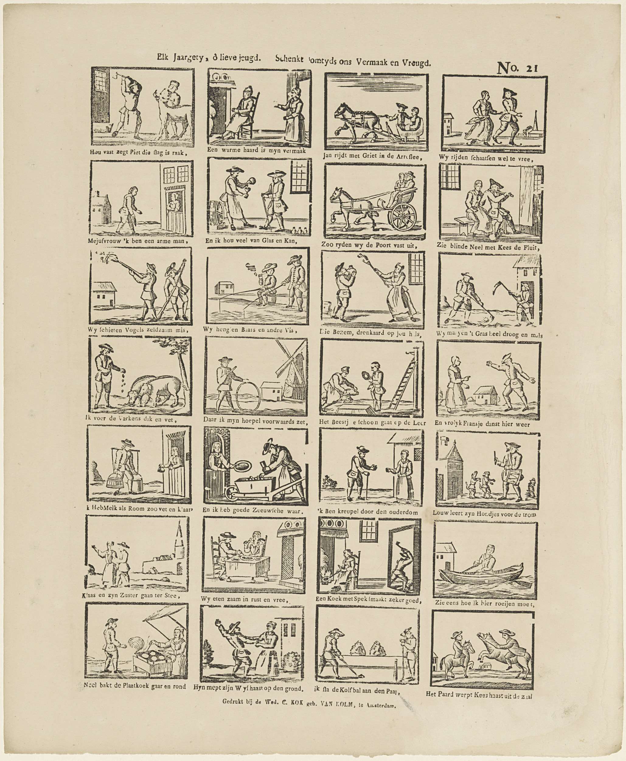Blad met 28 voorstellingen van landelijke taferelen tijdens de verschillende jaargetijden. Onder elke afbeelding een onderschrift. Genummerd rechtsboven: No. 21.