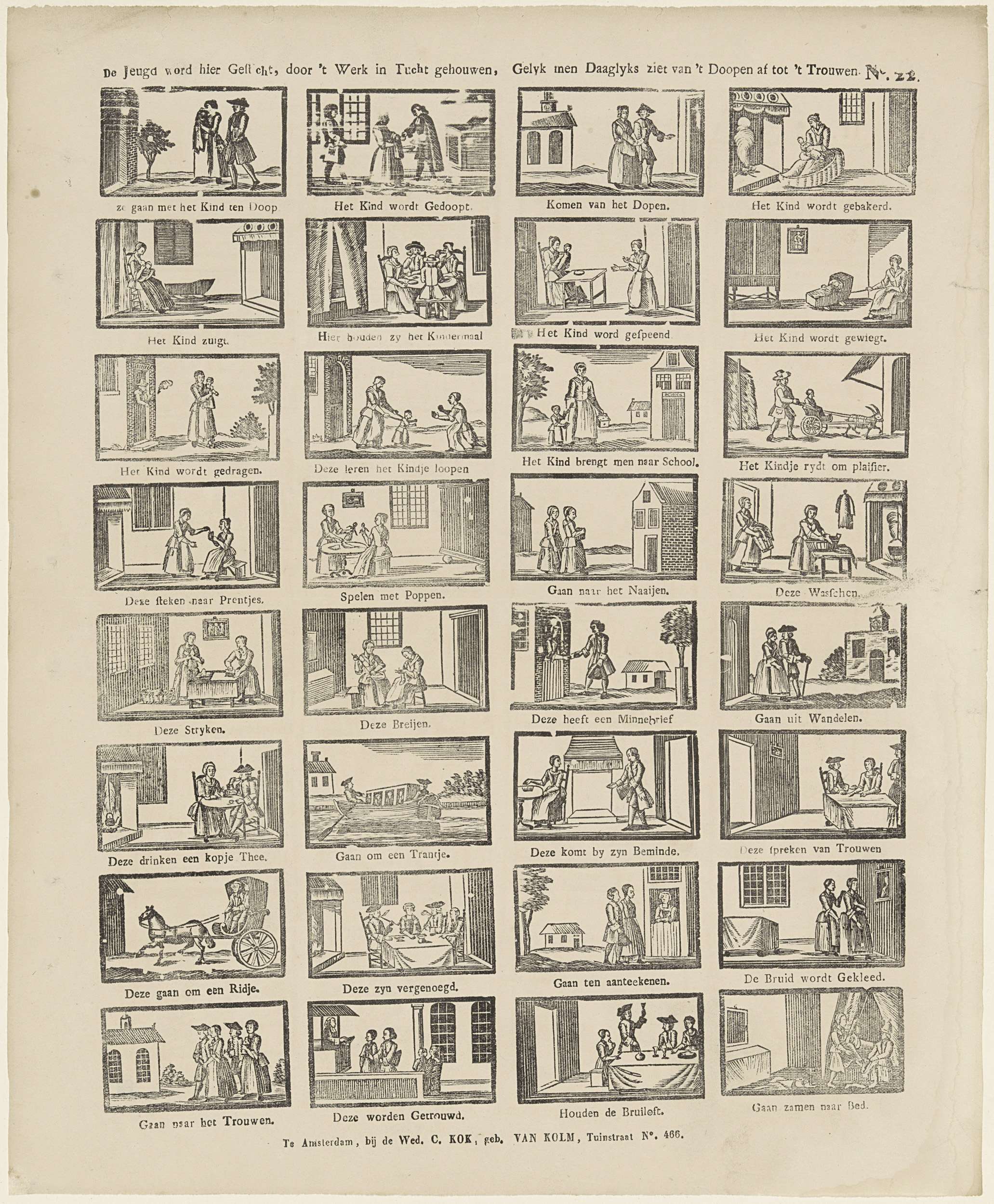 Blad met 32 voorstellingen van verschillende fasen uit het leven van de mens, van geboorte tot trouwen. Onder elke afbeelding een onderschrift. Genummerd rechtsboven: No. 22.