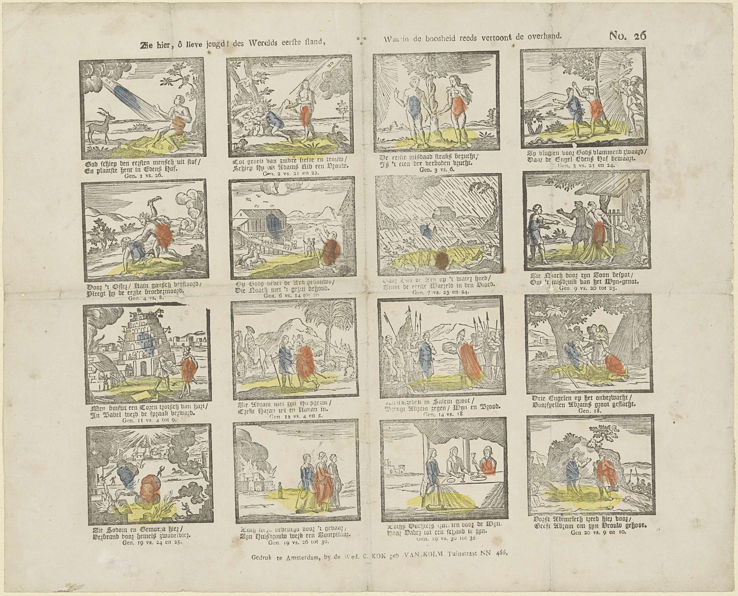 Blad met 16 voorstellingen uit het Oude Testament, waaronder de verdrijving van Adam en Eva uit het paradijs, Kaïn die Abel vermoordt en de Toren van Babel. Onder elke voorstelling een tweeregelig vers en de bijbehorende Bijbelverwijzing. Genummerd rechtsboven: No. 26.