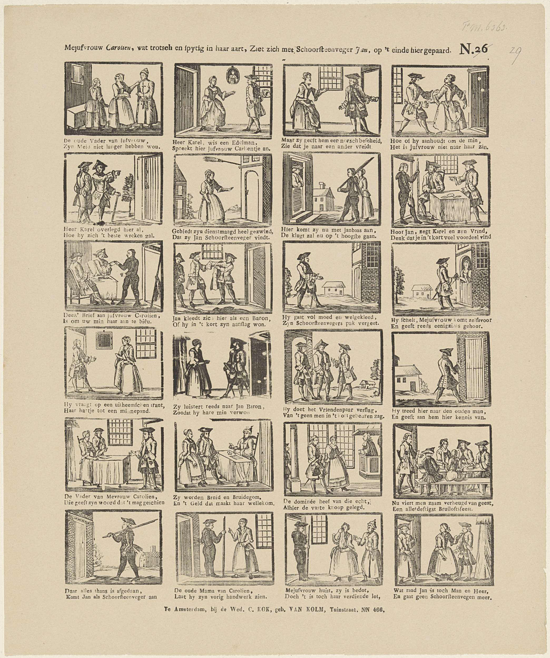 Blad met 24 voorstellingen uit het verhaal van Carolien en schoorsteenveger Jan. Twee afgewezen minnaars van de hoogmoedige Carolien sturen haar een schoorsteenveger die zij rijk hebben uitgedost en goed van geld voorzien. Carolien wordt verliefd en trouwt de vermeende edelman, die daags na het huwelijk zich voordoet voor wat hij werkelijk is. Chrysenia schikt ...
