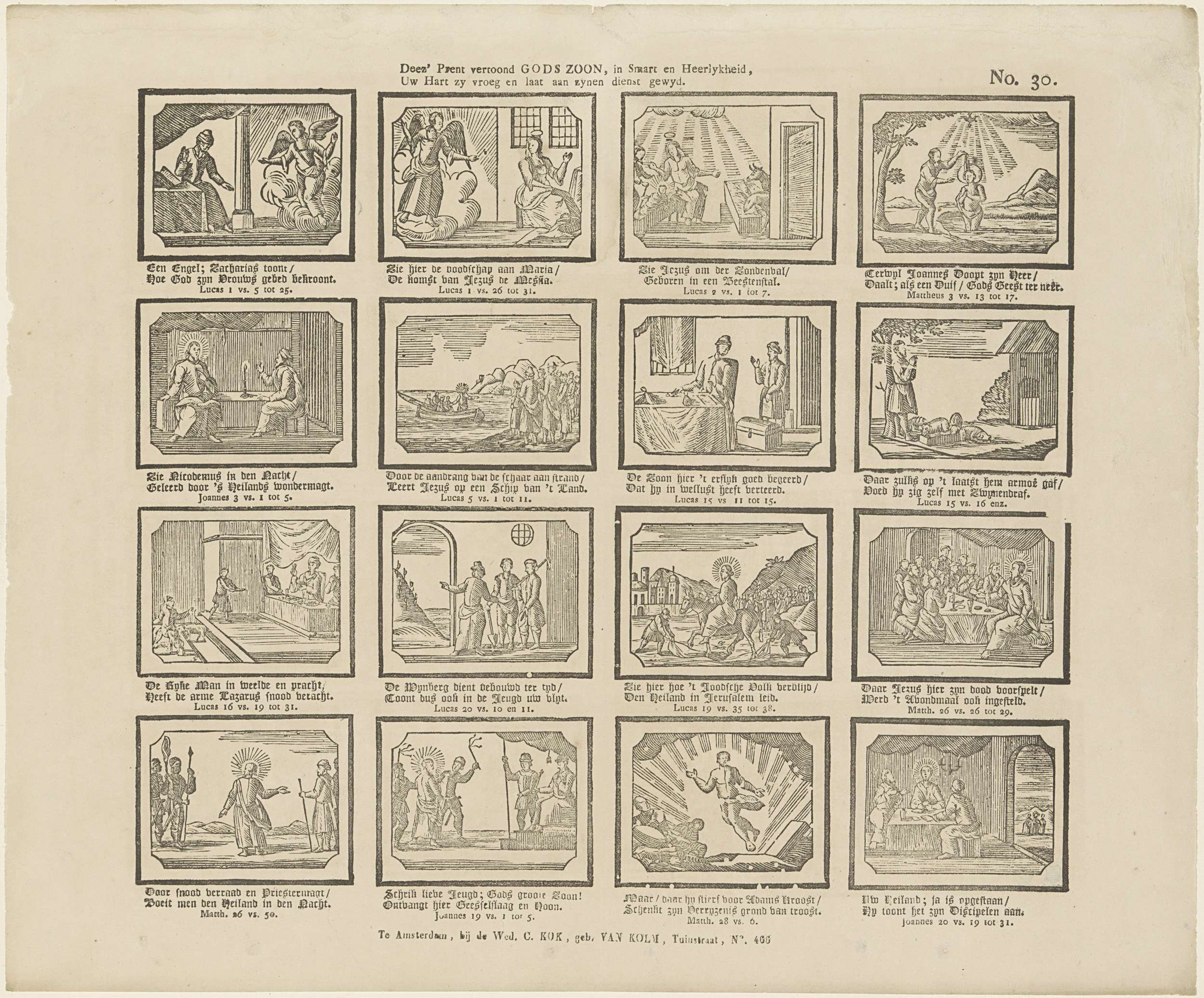 Blad met 16 voorstellingen over het leven van Jezus, waaronder de doop in de Jordaan, de intocht in Jeruzalem en de Geseling. Onder elke afbeelding een tweeregelig vers en bijbehorende Bijbelverwijzing. Genummerd rechtsboven: No. 30.