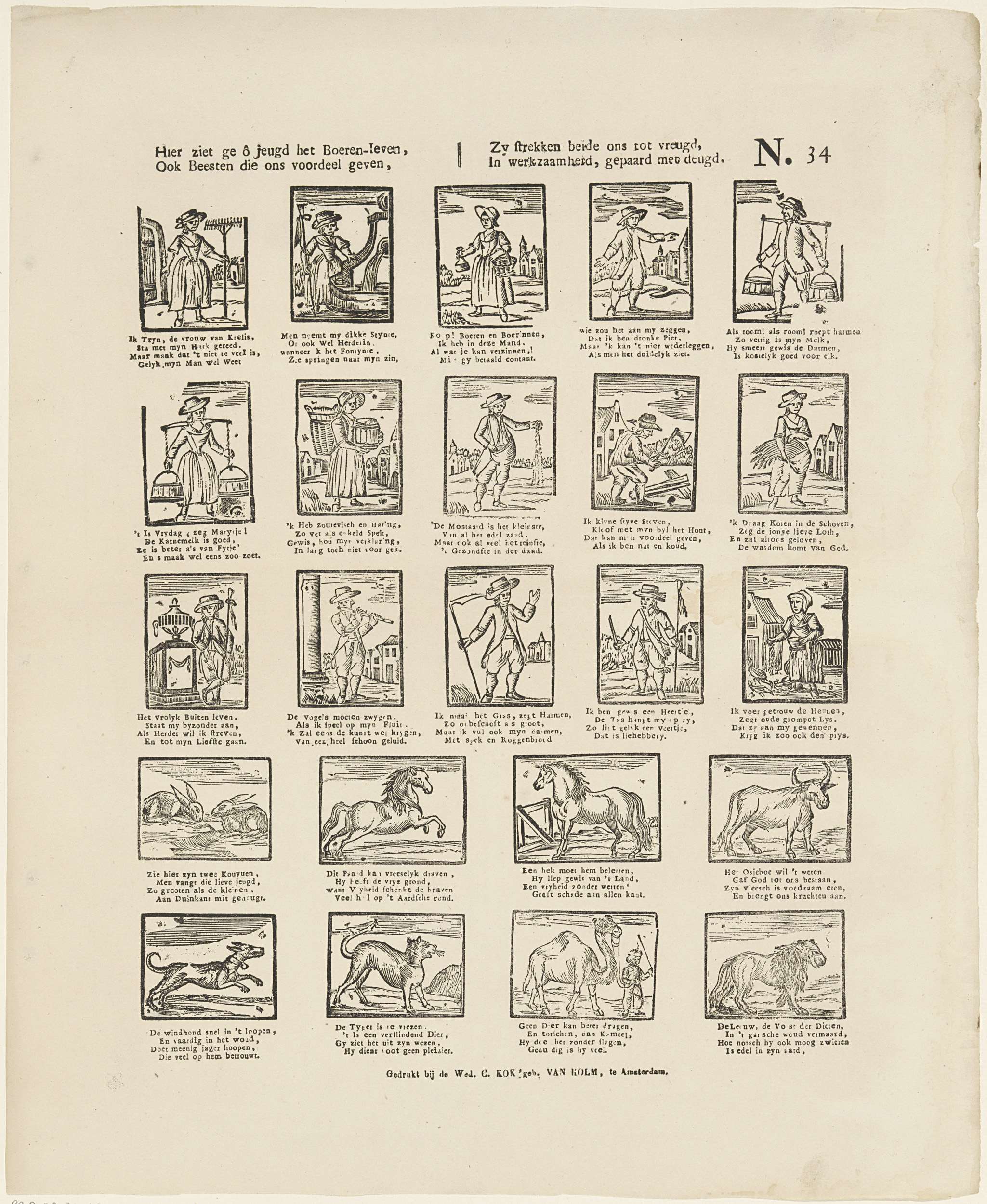 Blad met 25 voorstellingen van verschillende dieren en figuren. Onder elke voorstelling een vierregelig vers. Genummerd rechtsboven: N. 34.
