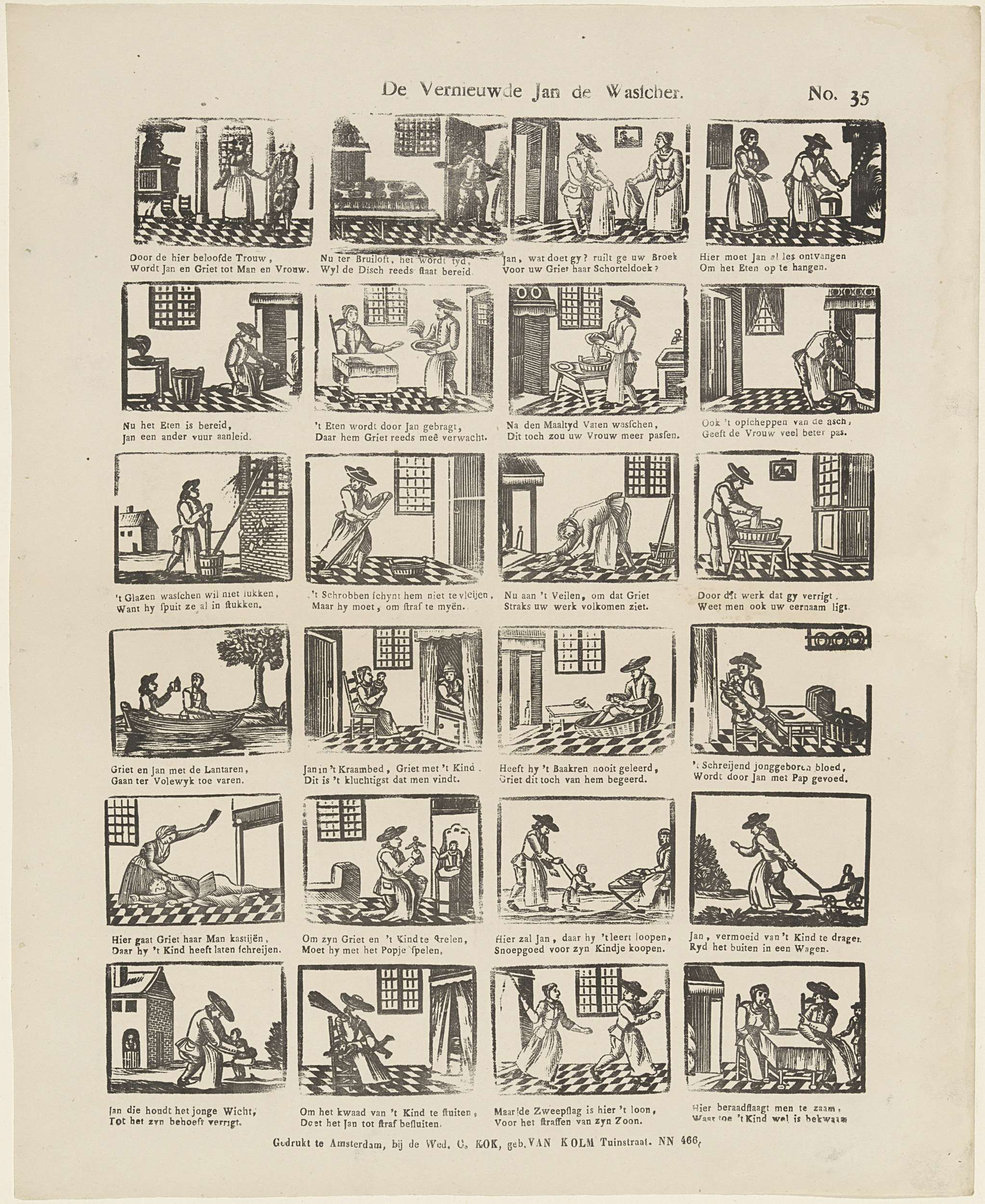 Blad met 24 voorstellingen uit het leven van Jan de Wasser, een man die van zijn vrouw Griet, die de broek aan heeft, al het huishoudelijk werk moet doen. Onder elke afbeelding een tweeregelig vers. Genummerd rechtsboven: No. 35.