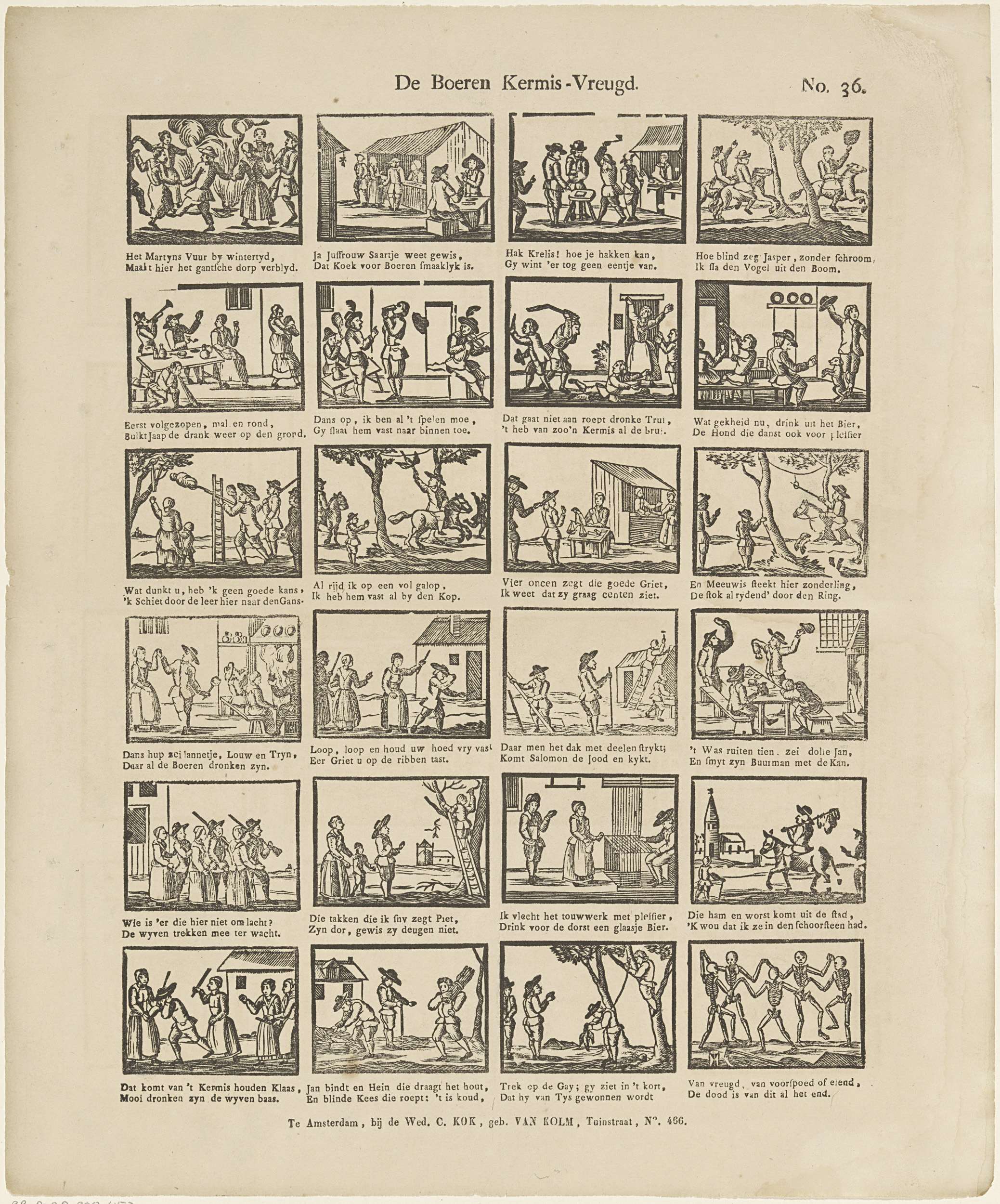 Blad met 24 voorstellingen van het Sint-Maartensvuur en vermaak op de kermis. Onder elke afbeelding een tweeregelig vers. Genummerd rechtsboven: No. 36.