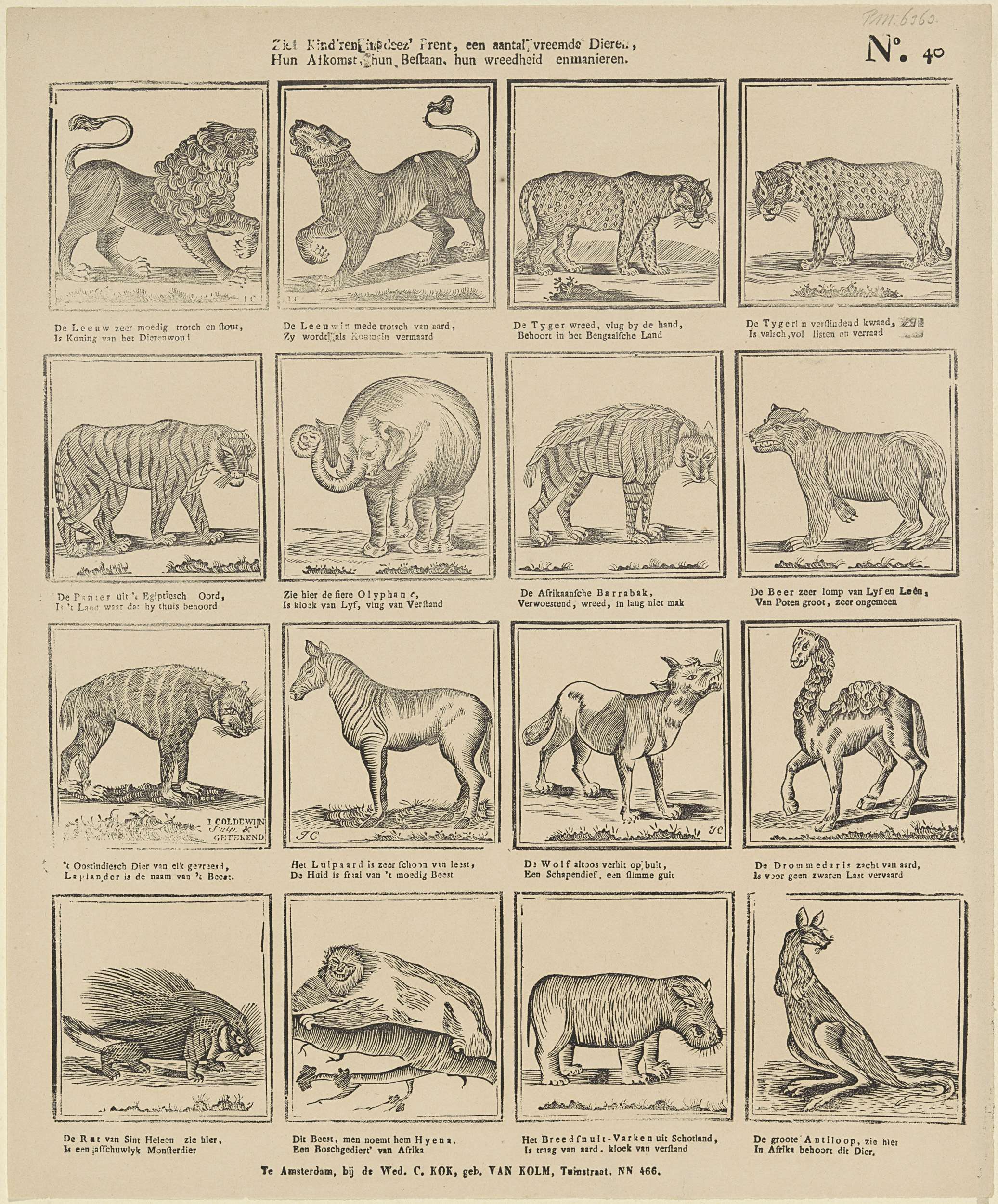 Blad met 16 voorstellingen van wilde dieren, waaronder een leeuw, een olifant, een zebra en dromedaris. Onder elke afbeelding een tweeregelig vers. Genummerd rechtsboven: No. 40.