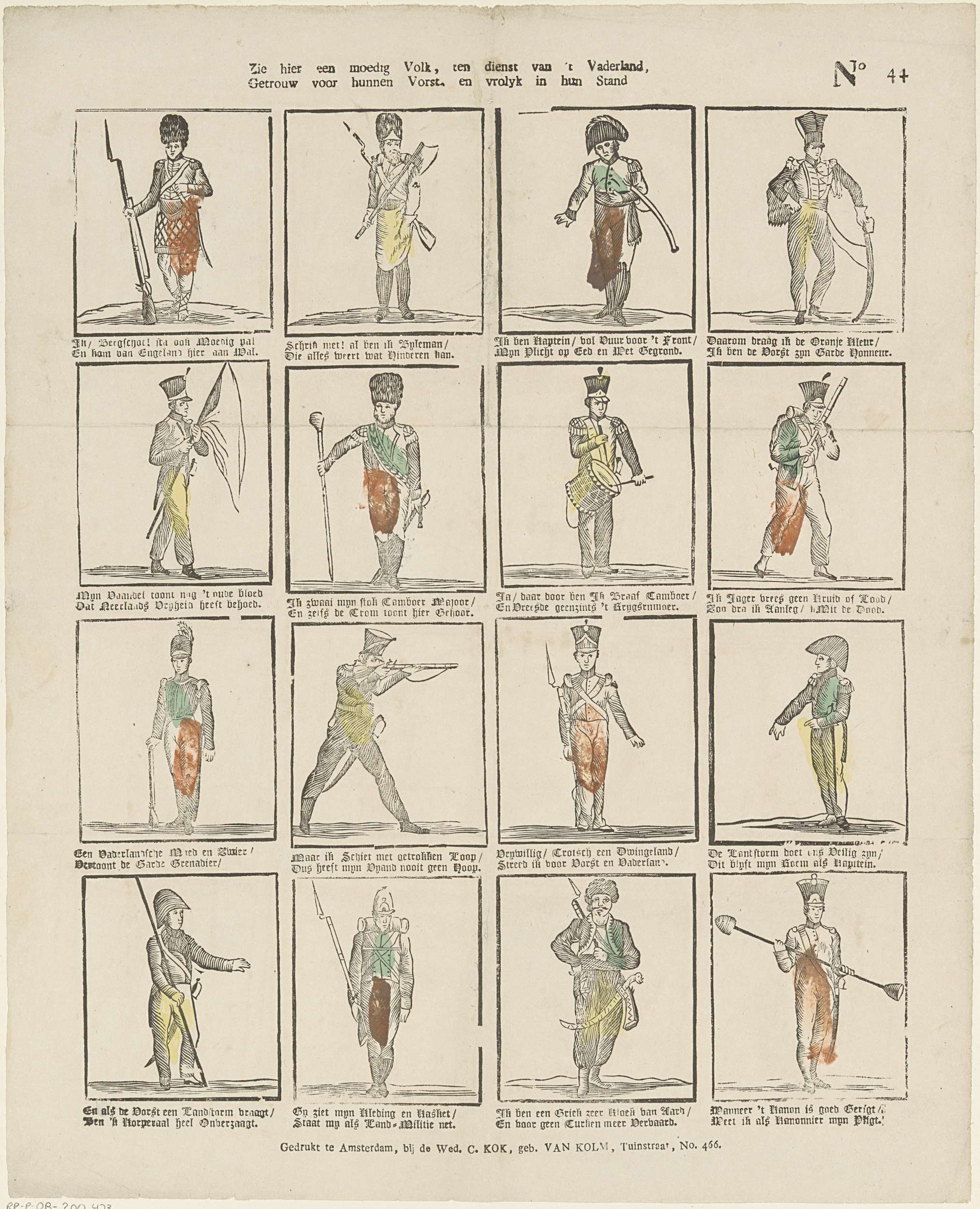 Blad met 16 voorstellingen van militairen met wapens en instrumenten. Onder elke afbeelding een tweeregelig vers. Genummerd rechtsboven: No. 44.
