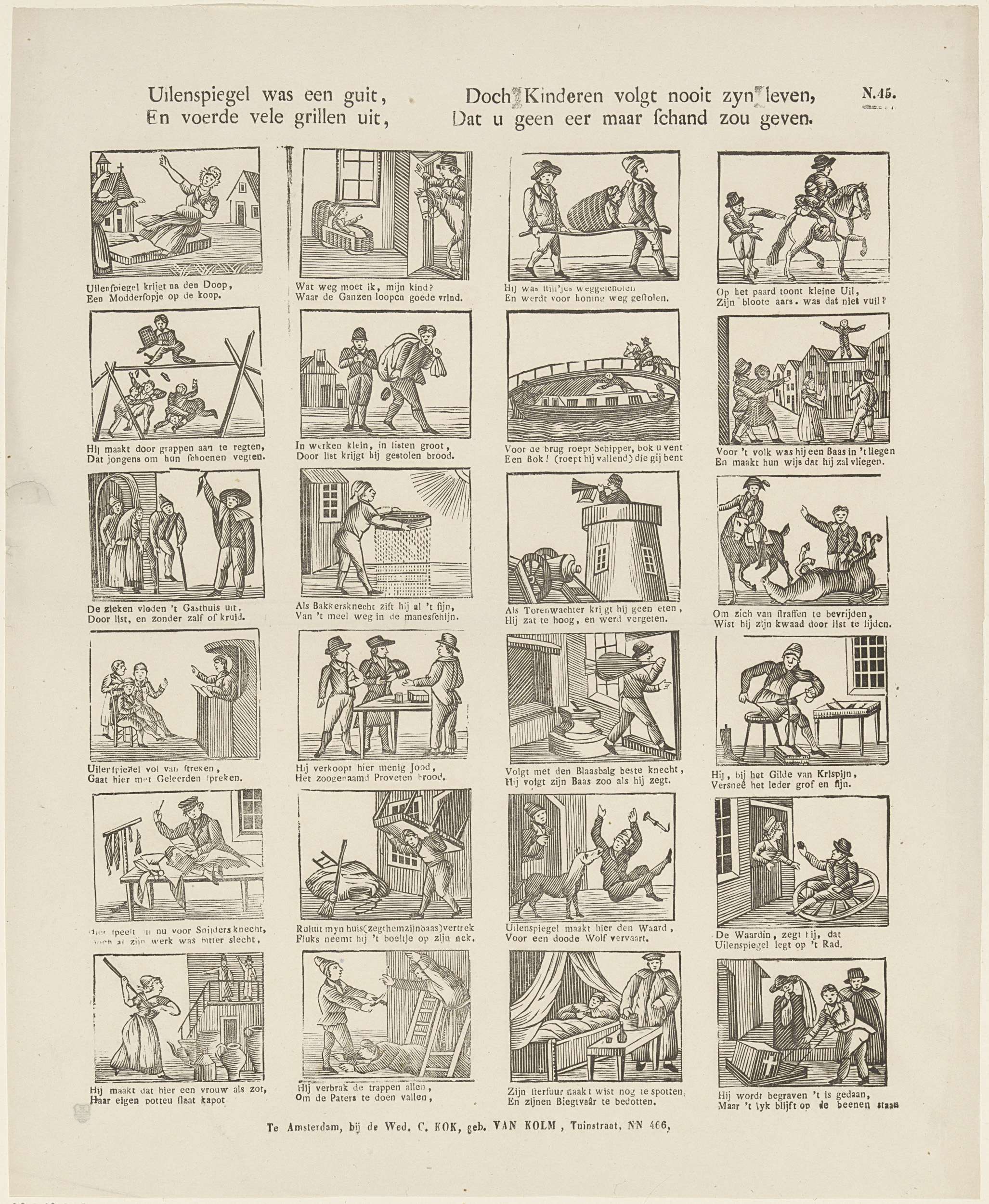 Blad met 24 voorstellingen over het leven van Tijl Uilenspiegel. Onder elke afbeelding een tweeregelig vers. Genummerd rechtsboven: No. 45.