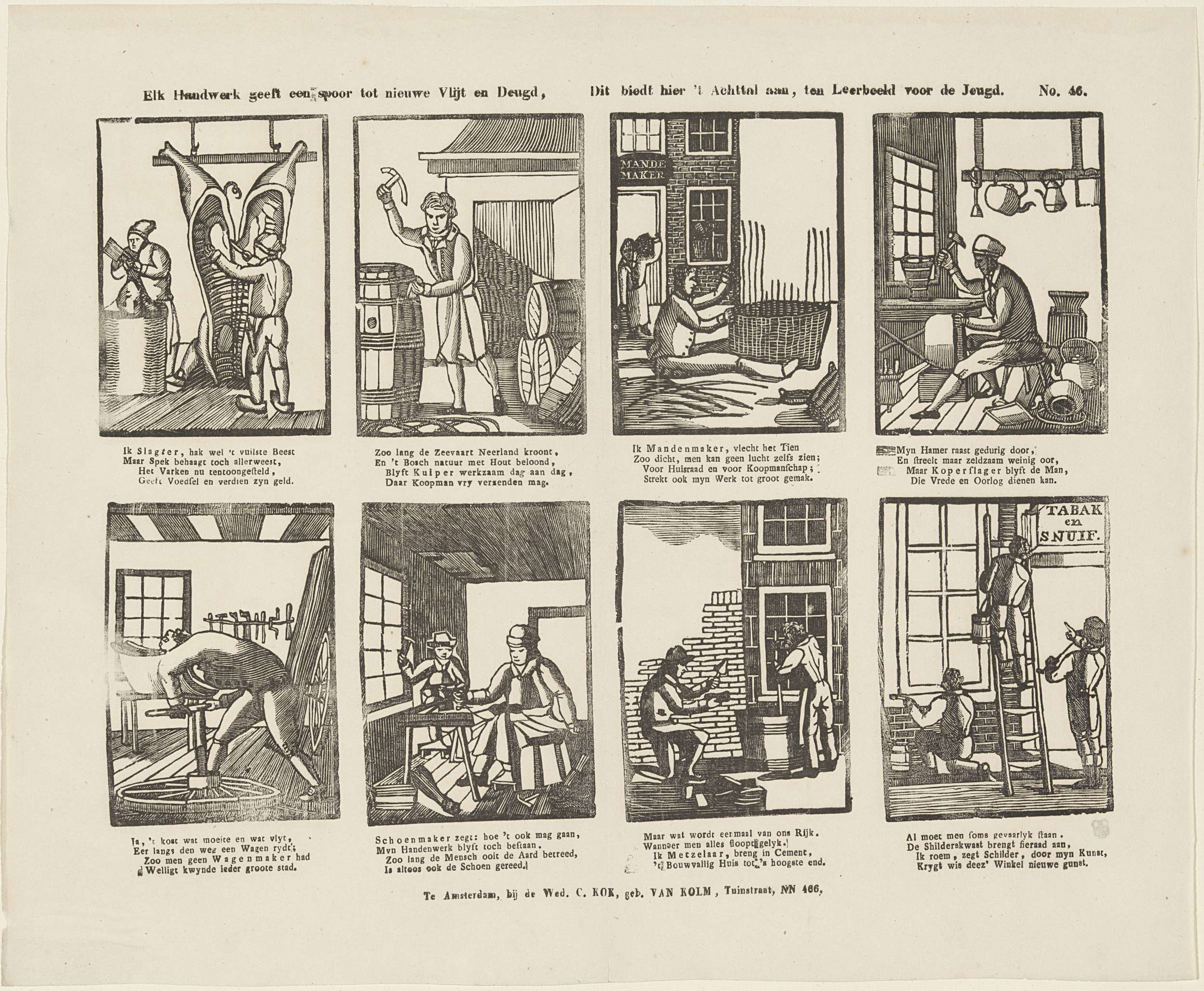 Blad met 8 voorstellingen van ambachtslieden en beroepen, zoals slager, kuiper, mandenvlechter en metselaar. Onder elke afbeelding een vierregelig vers. Genummerd rechtsboven: No. 46.