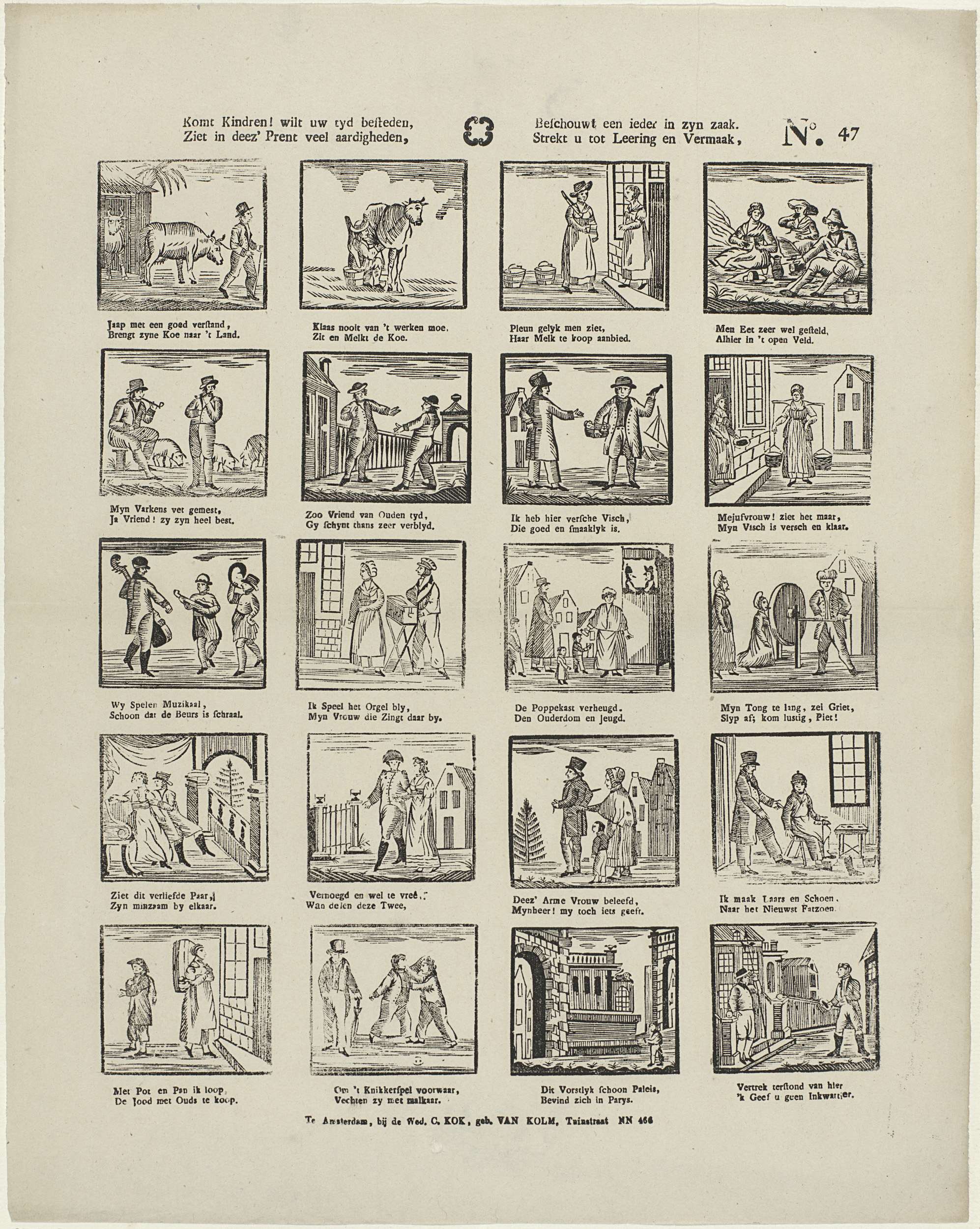 Blad met 20 voorstellingen van verschillende bezigheden, waaronder een koe melken, muziek maken en wandelen. Onder elke afbeelding een tweeregelig vers. Genummerd rechtsboven: No. 47.