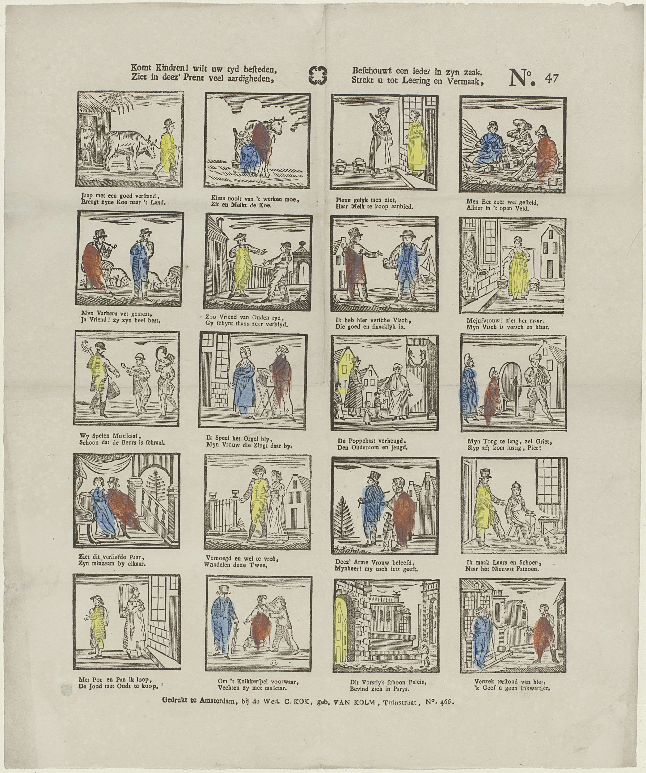 Blad met 20 voorstellingen van verschillende bezigheden, waaronder een koe melken, muziek maken en wandelen. Onder elke afbeelding een tweeregelig vers. Genummerd rechtsboven: No. 47.