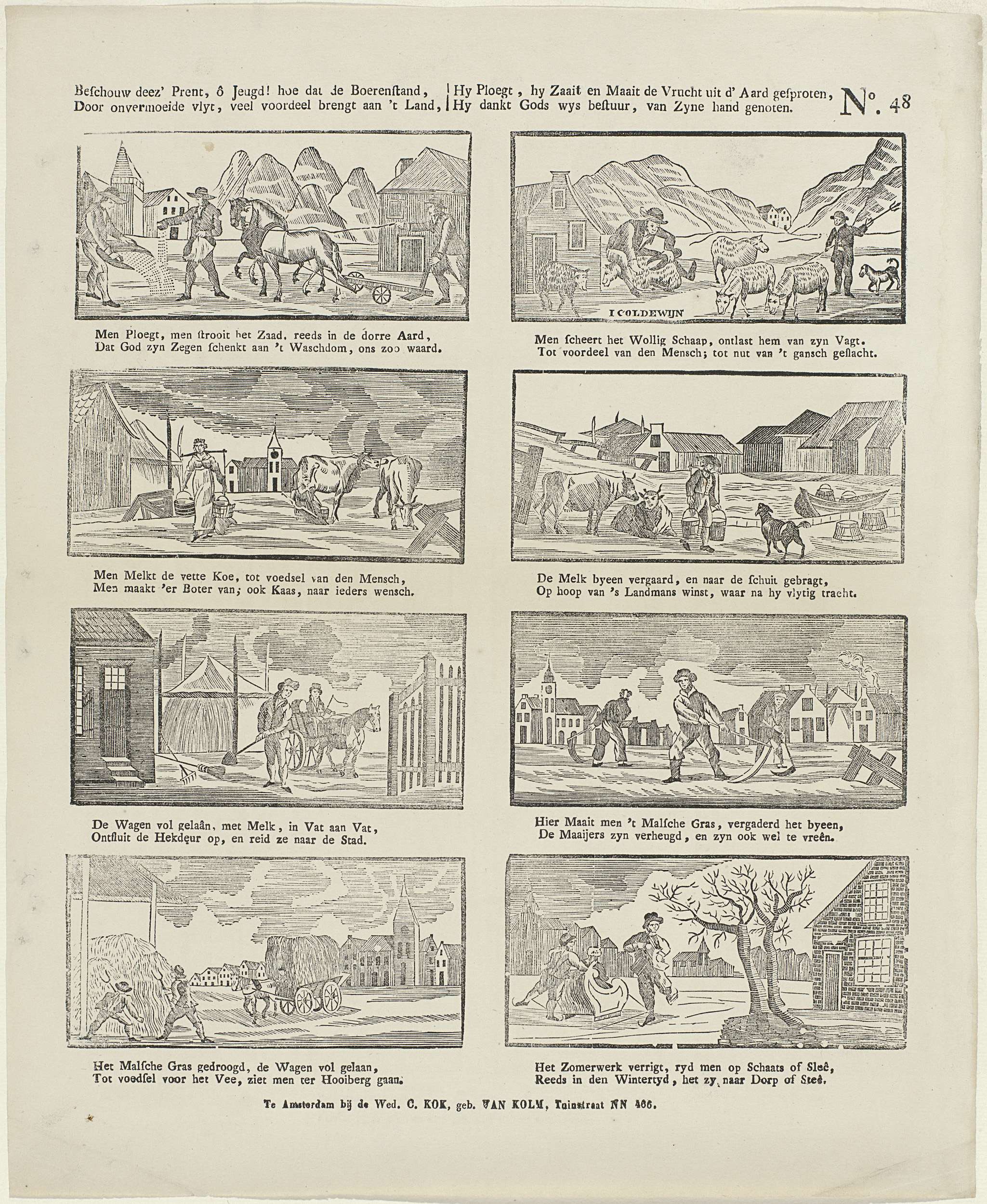 Blad met 8 voorstellingen van bezigheden voor boeren, waaronder het veld ploegen, schapen scheren en grasmaaien. Onder elke afbeelding een tweeregelig vers. Genummerd rechtsboven: No. 48.
