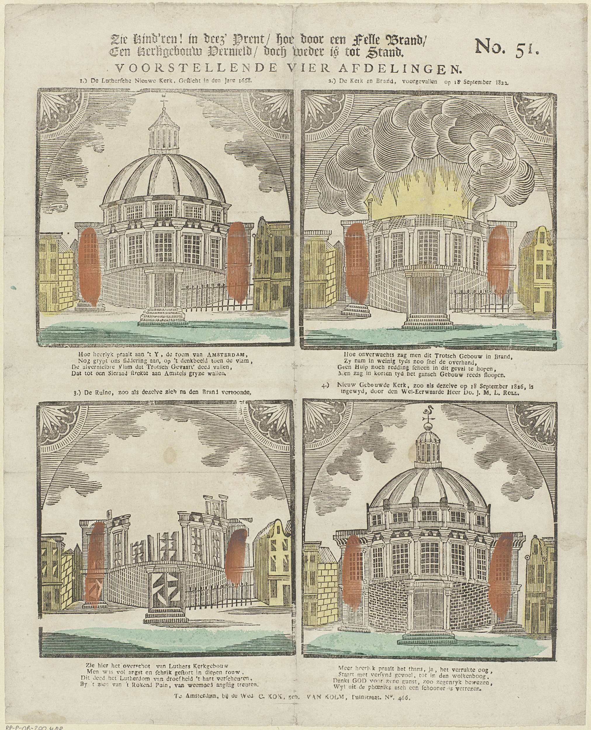 Blad met 4 voorstellingen van verschillende toestanden van de Ronde Lutherse Kerk in Amsterdam, waaronder de kerk in brand op 18 september 1822, als een ruïne en opnieuw opgebouwd. Onder elke afbeelding een vierregelig vers en boven elke afbeelding een nummer en een titel. Genummerd rechtsboven: No. 51.