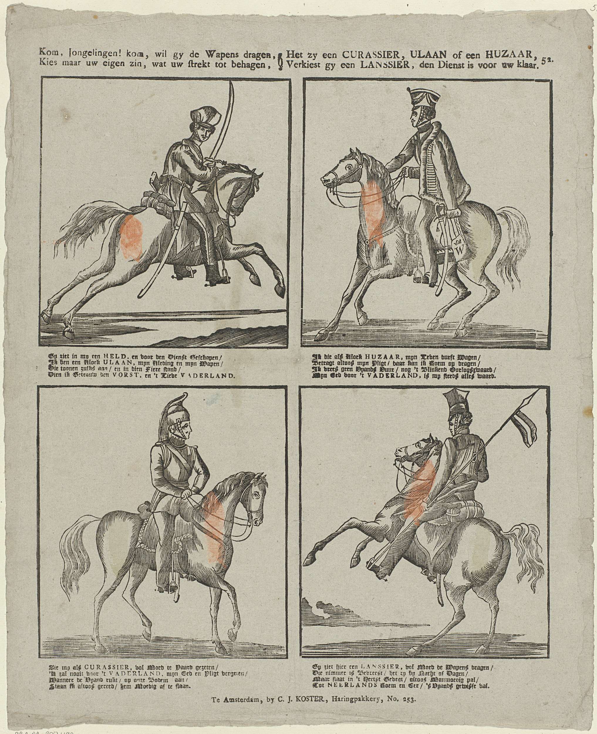 Komt, jongelingen komt, wilt gy de wapens dragen, / Kies maar uw eigen zin, wat uw strekt tot behagen, / Het zy een curassier, ulaan of een huzaar, / Verkiest gy een lanssier, de dienst is voor uw klaar