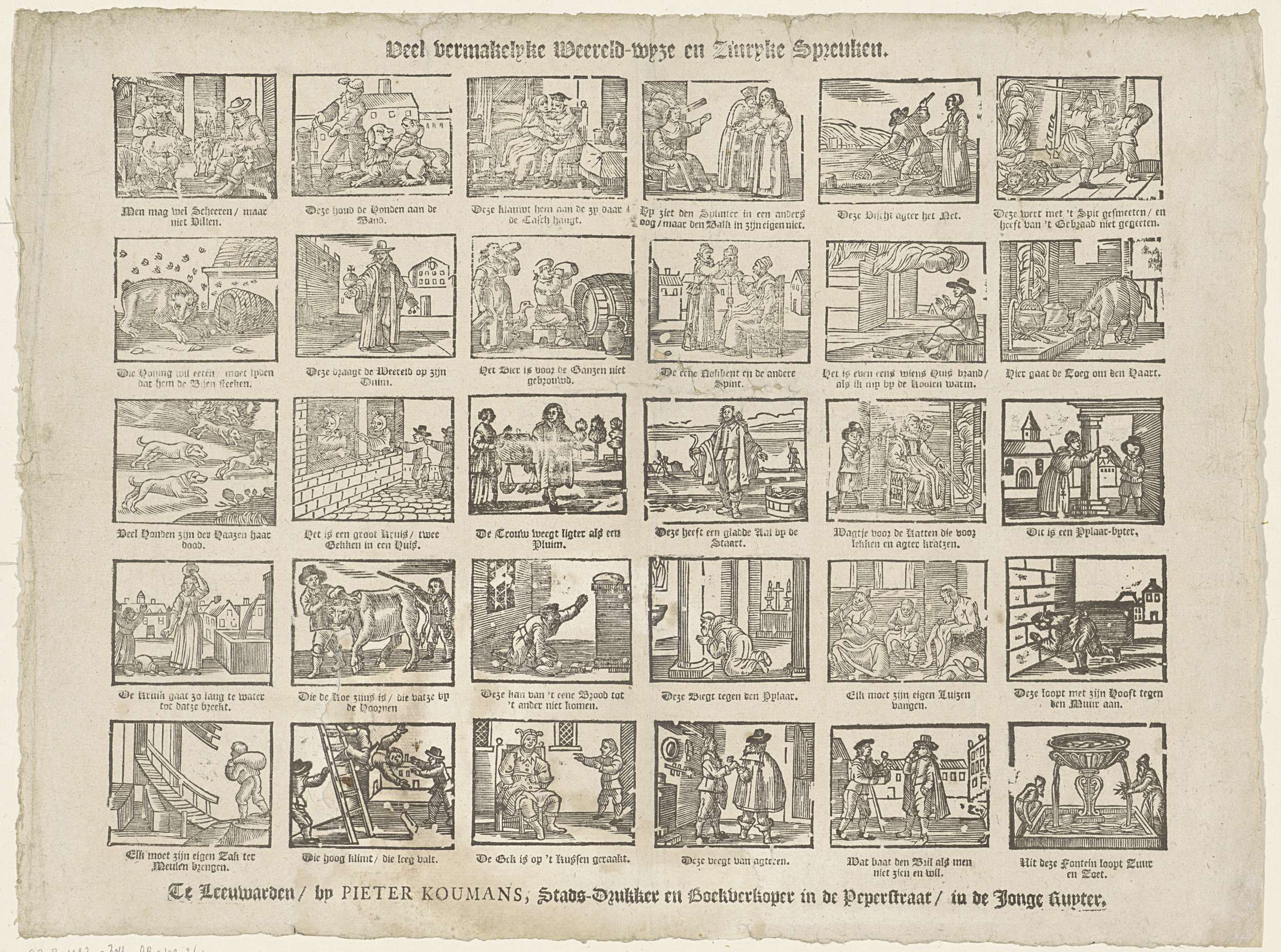 Blad met 30 verbeeldingen van spreekwoorden. Onder elke afbeelding een spreekwoord.