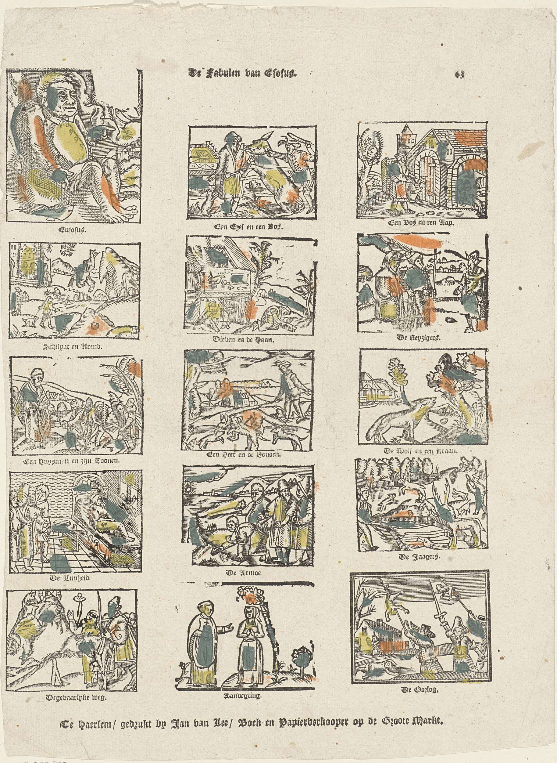 Blad met 15 voorstellingen uit de fabelen van Aesopus. Onder elke afbeelding een onderschrift. Genummerd rechtsboven: 43.