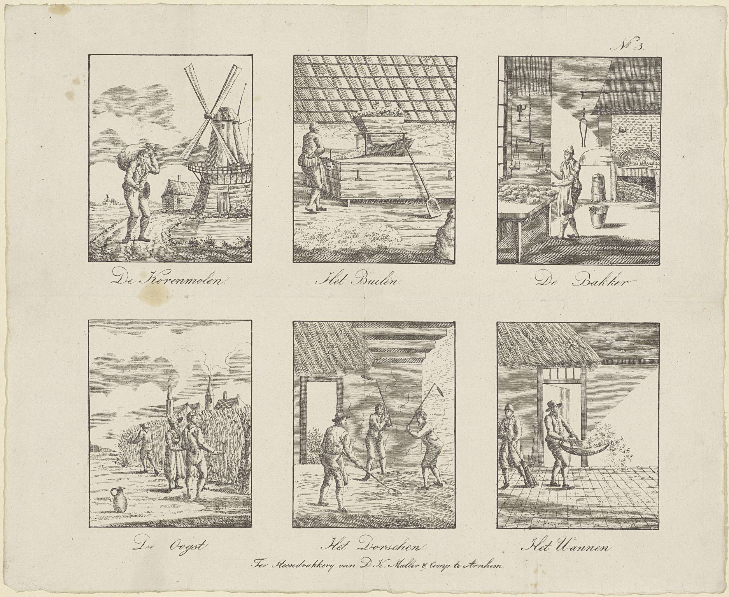 Blad met 6 voorstellingen over de graanoogst en verwerking van het graan. Onder elke afbeelding een onderschrift. Genummerd rechtsboven: No. 3.