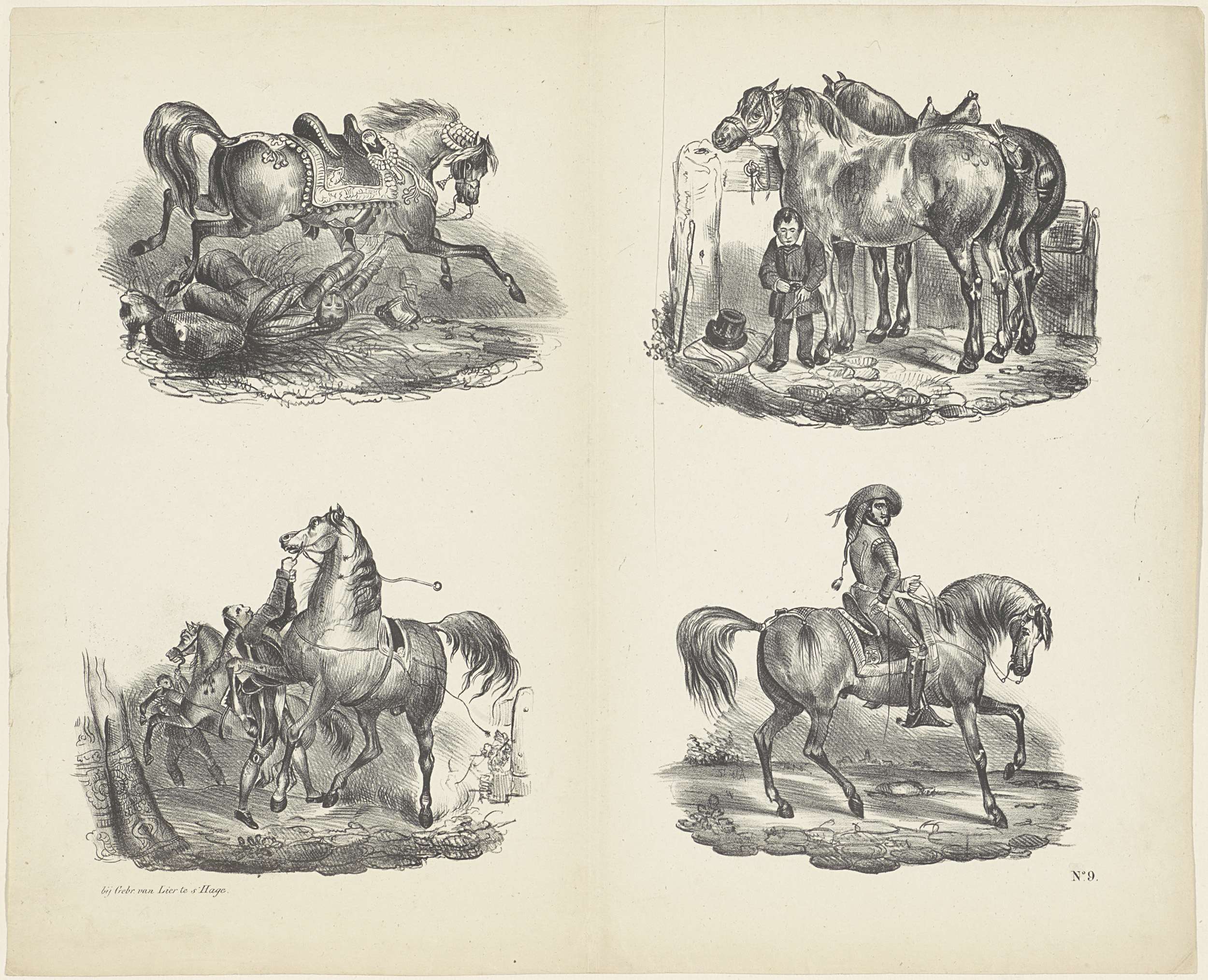 Blad met vier voorstellingen van paarden in verschillende houdingen. Genummerd rechtsonder: No. 9.