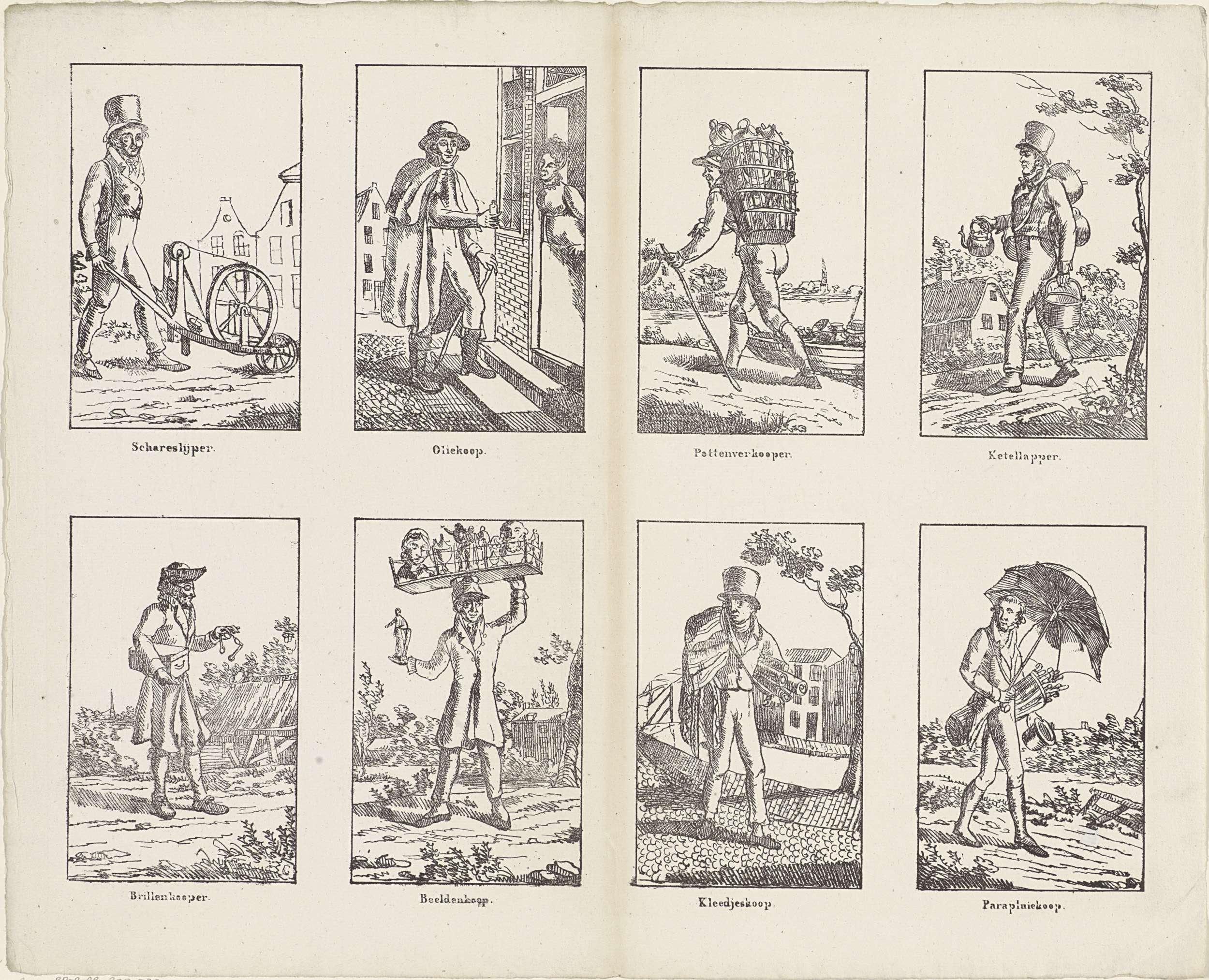 Blad met 8 voorstellingen van mannelijke beroepen, waaronder scharenslijper, pottenverkoper en ketellapper. Onder elke afbeelding een onderschrift.