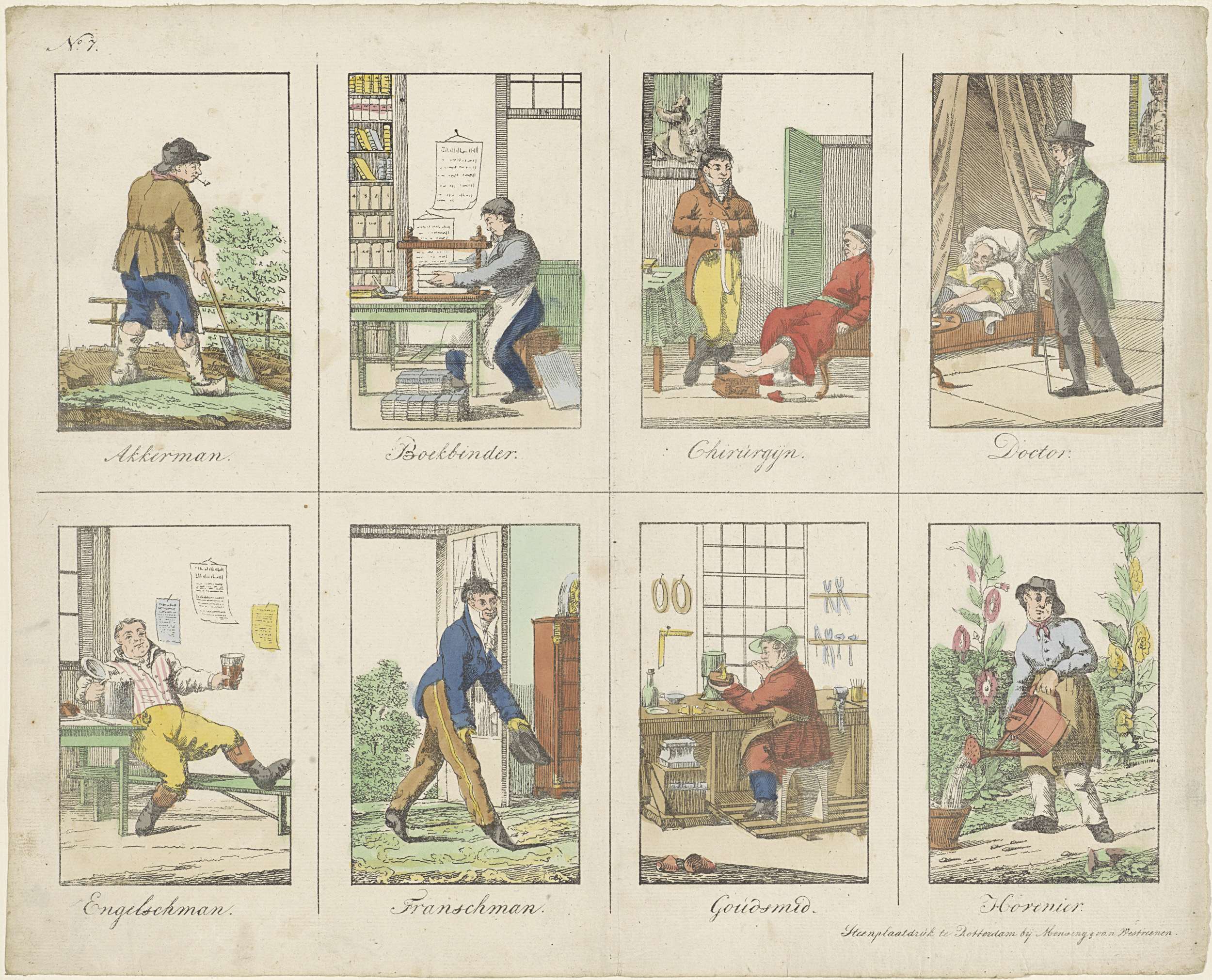 Blad met 8 voorstellingen van de letters van het alfabet (A-H) geïllustreerd met beroepen en nationaliteiten waarvan de woorden met de betreffende letter beginnen. Genummerd linksboven: No. 7.