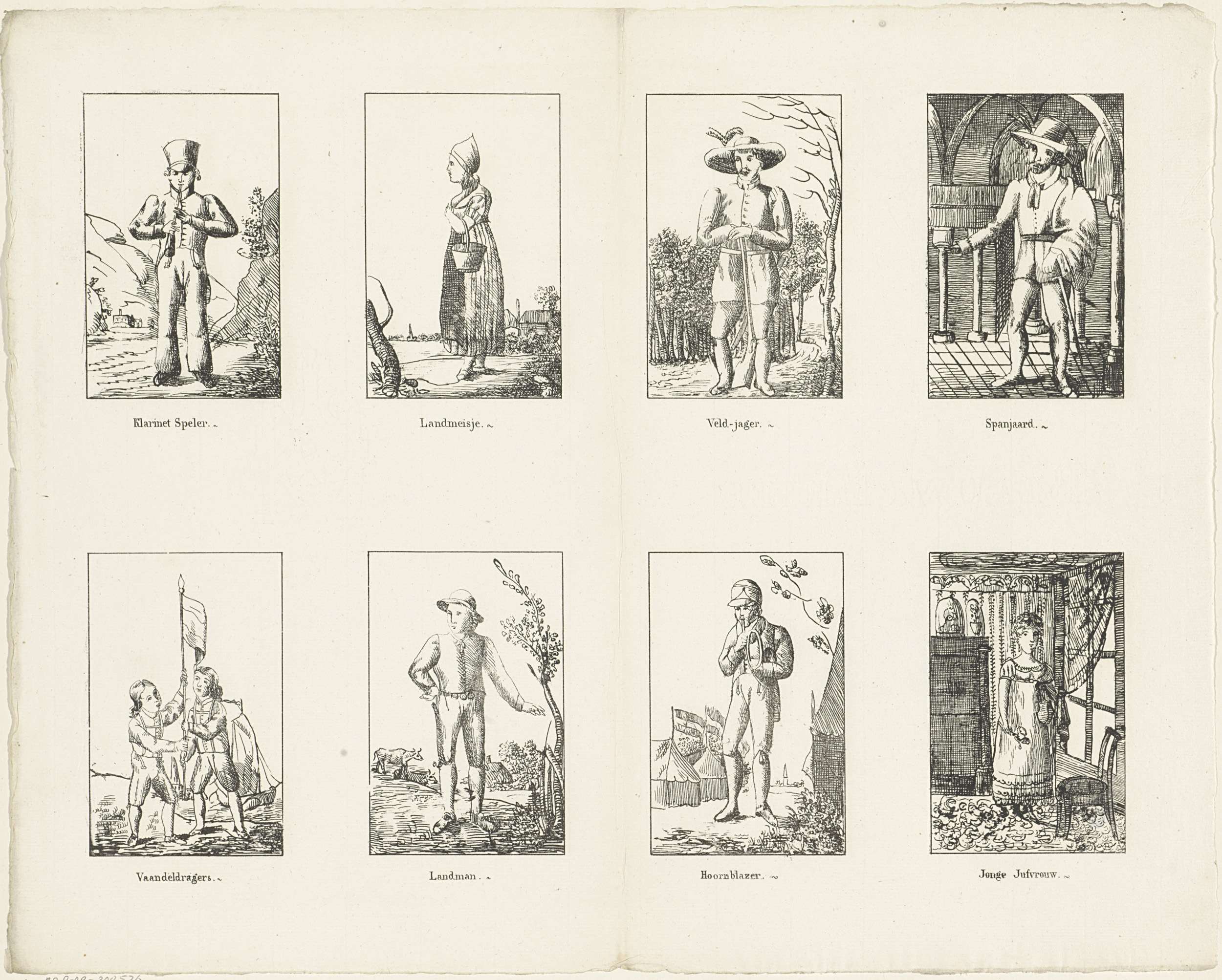 Blad met 8 voorstellingen van beroepen en figuren, waaronder boerin, jager en hoornblazer. Onder elke afbeelding een onderschrift.