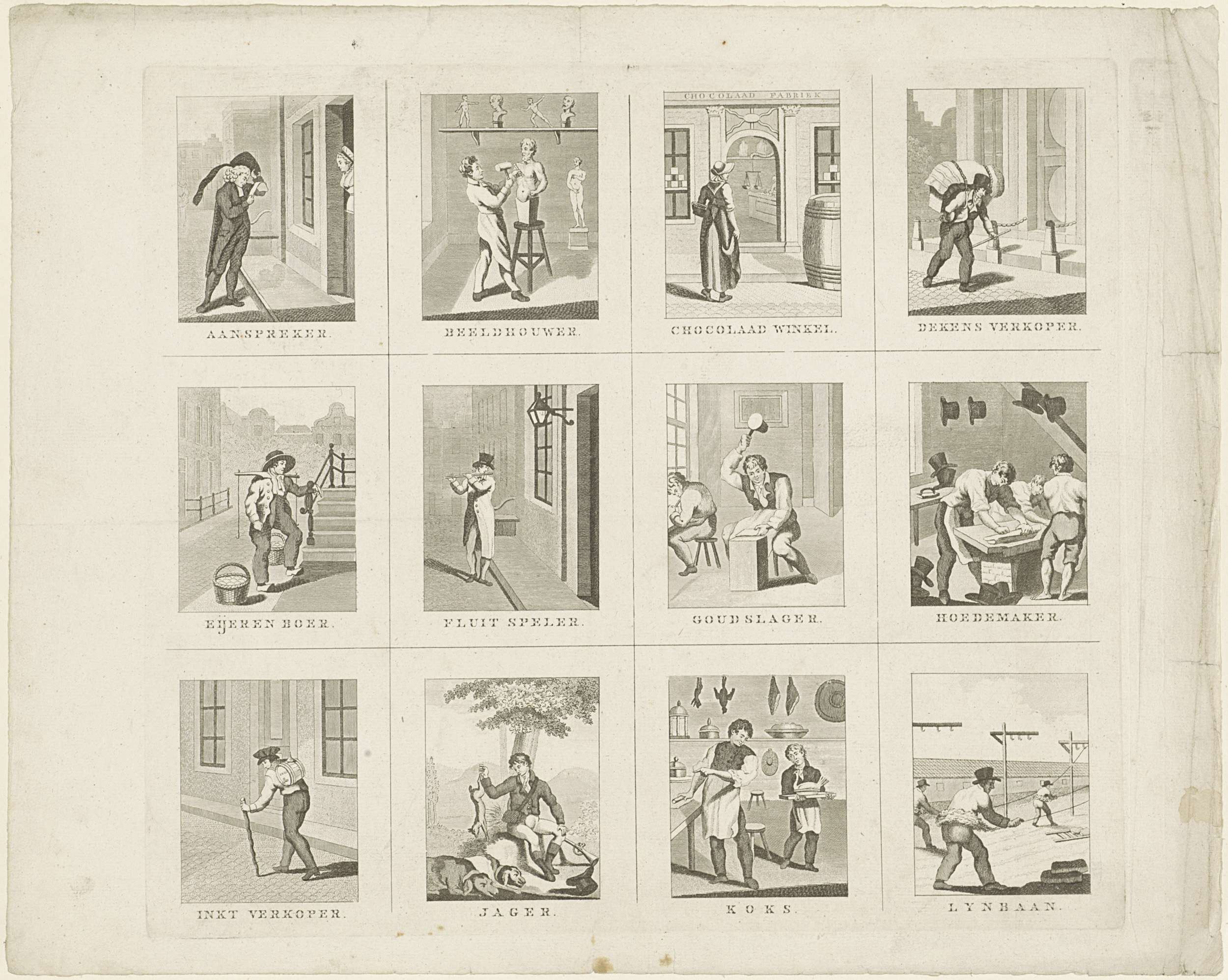 Blad met 12 voorstellingen van ambachtslieden en beroepen, zoals beeldhouwer, dekenverkoper en jager. Onder elke afbeelding een onderschrift.