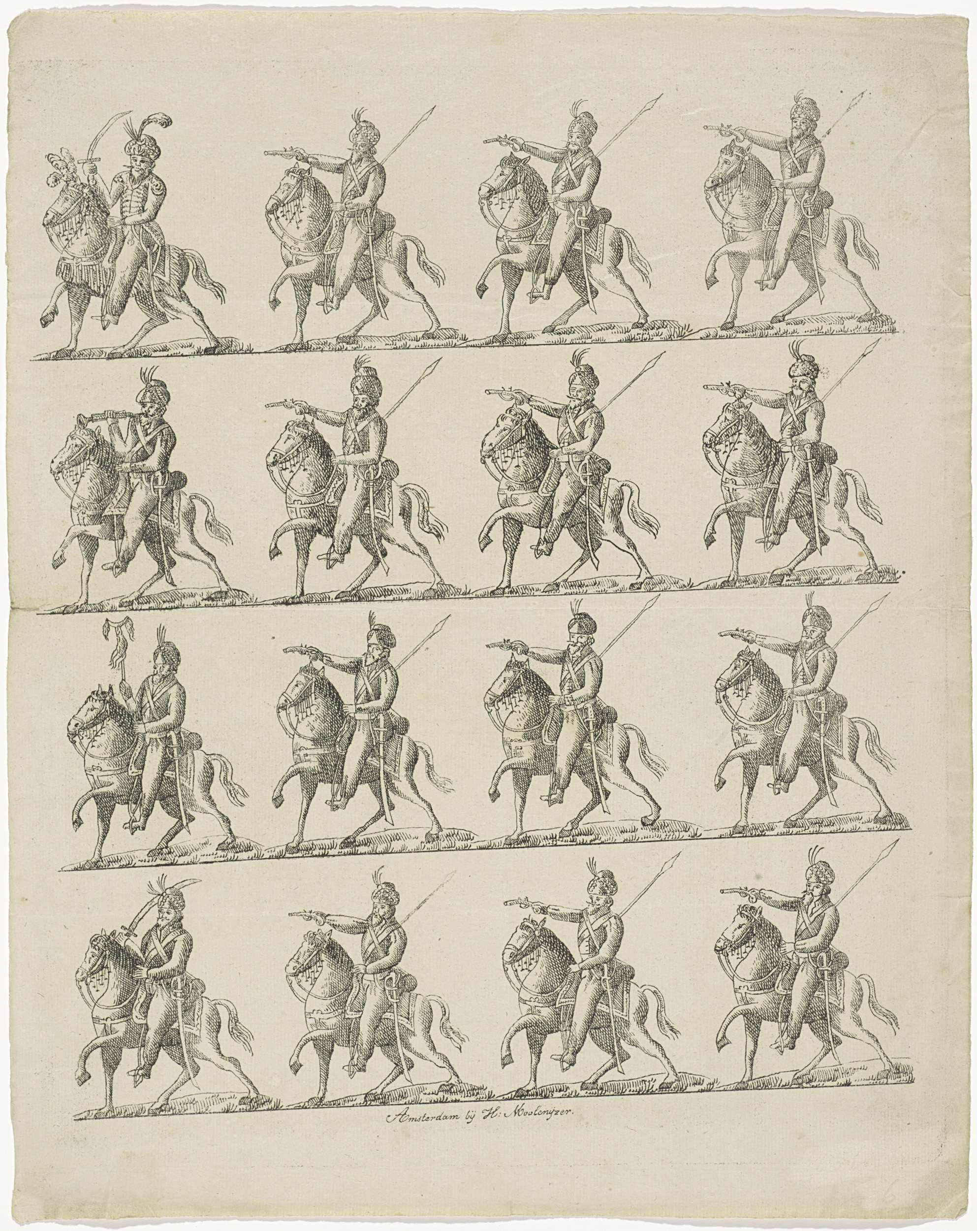 Blad met 16 voorstellingen van soldaten te paard met wapens, vaandels en instrumenten.